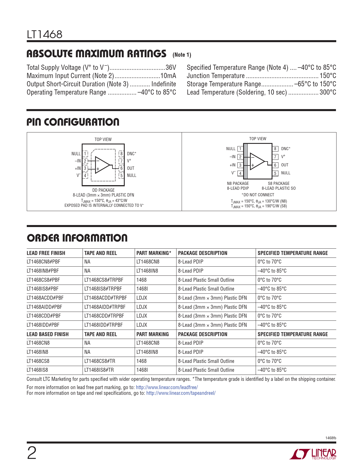 LT1468CN8#PBF NA LT1468CN8 8-Lead PDIP 0°C to 70°C LT1468IN8#PBF NA LT1468IN8 8-Lead PDIP –40°C to 85°C LT1468CS8#PBF LT1468CS8#TRPBF 1468 8-Lead Plastic Small Outline 0°C to 70°C LT1468IS8#PBF LT1468IS8#TRPBF 1468I 8-Lead Plastic Small Outline –40°C to 85°C LT1468ACDD#PBF LT1468ACDD#TRPBF LDJX 8-Lead (3mm × 3mm) Plastic DFN 0°C to 70°C LT1468AIDD#PBF LT1468AIDD#TRPBF LDJX 8-Lead (3mm × 3mm) Plastic DFN –40°C to 85°C LT1468CDD#PBF LT1468CDD#TRPBF LDJX 8-Lead (3mm × 3mm) Plastic DFN 0°C to 70°C LT1468IDD#PBF LT1468IDD#TRPBF LDJX 8-Lead (3mm × 3mm) Plastic DFN –40°C to 85°C