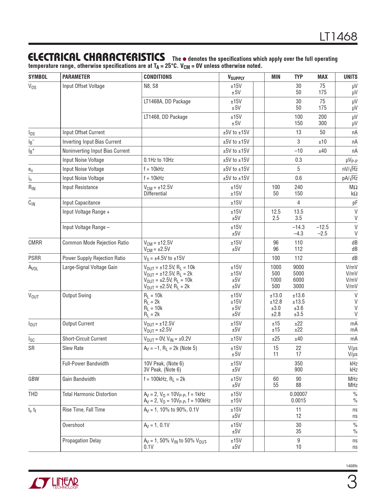VOS Input Offset Voltage N8, S8 ±15V 30 75 μV ± 5V 50 175 μV LT1468A, DD Package ±15V 30 75 μV ± 5V 50 175 μV LT1468, DD Package ±15V 100 200 μV ± 5V 150 300 μV IOS Input Offset Current ±5V to ±15V 13 50 nA I – B Inverting Input Bias Current ±5V to ±15V 3 ±10 nA I + B Noninverting Input Bias Current ±5V to ±15V –10 ±40 nA Input Noise Voltage 0.1Hz to 10Hz ±5V to ±15V 0.3 μVP-P en Input Noise Voltage f = 10kHz ±5V to ±15V 5 nV/√Hz in Input Noise Voltage f = 10kHz ±5V to ±15V 0.6 pA/√Hz RIN Input Resistance VCM = ±12.5V ±15V 100 240 MΩ Differential ±15V 50 150 kΩ CIN Input Capacitance ±15V 4 pF Input Voltage Range + ±15V 12.5 13.5 V ±5V 2.5 3.5 V Input Voltage Range – ±15V –14.3 –12.5 V ±5V –4.3 –2.5 V CMRR Common Mode Rejection Ratio VCM = ±12.5V ±15V 96 110 dB VCM = ±2.5V ±5V 96 112 dB PSRR Power Supply Rejection Ratio VS = ±4.5V to ±15V 100 112 dB AVOL Large-Signal Voltage Gain VOUT = ±12.5V, RL = 10k ±15V 1000 9000 V/mV VOUT = ±12.5V, RL = 2k ±15V 500 5000 V/mV VOUT = ±2.5V, RL = 10k ±5V 1000 6000 V/mV VOUT = ±2.5V, RL = 2k ±5V 500 3000 V/mV VOUT Output Swing RL = 10k ±15V ±13.0 ±13.6 V RL = 2k ±15V ±12.8 ±13.5 V RL = 10k ± 5V ±3.0 ±3.6 V RL = 2k ±5V ±2.8 ±3.5 V IOUT Output Current VOUT = ±12.5V ±15V ±15 ±22 mA VOUT = ±2.5V ±5V ±15 ±22 mA ISC Short-Circuit Current VOUT = 0V, VIN = ±0.2V ±15V ±25 ±40 mA SR Slew Rate AV = –1, RL = 2k (Note 5) ±15V 15 22 V/μs ± 5V 11 17 V/μs Full-Power Bandwidth 10V Peak, (Note 6) ±15V 350 kHz 3V Peak, (Note 6) ±5V 900 kHz GBW Gain Bandwidth f = 100kHz, RL = 2k ±15V 60 90 MHz ±5V 55 88 MHz THD Total Harmonic Distortion AV = 2, VO = 10VP-P, f = 1kHz ±15V 0.00007 % AV = 2, VO = 10VP-P, f = 100kHz ±15V 0.0015 % tr, tf Rise Time, Fall Time AV = 1, 10% to 90%, 0.1V ±15V 11 ns ±5V 12 ns Overshoot AV = 1, 0.1V ±15V 30 % ±5V 35 % Propagation Delay AV = 1, 50% VIN to 50% VOUT, ±15V 9 ns 0.1V ±5V 10 ns 1468fb 3