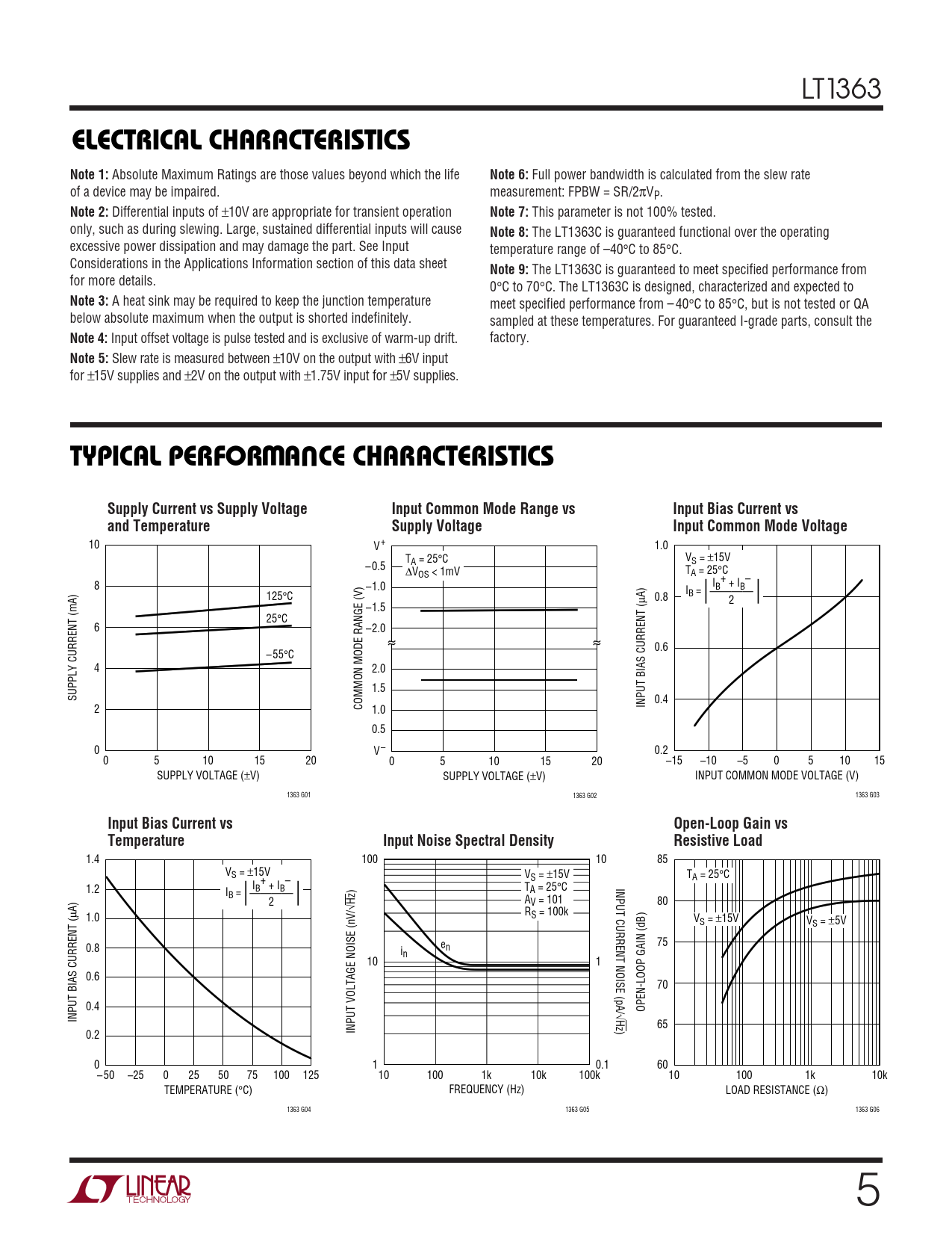 LT1363 ELECTRICAL CHARACTERISTICSNote 1: Absolute Maximum Ratings are those values beyond which the life Note 6: Full power bandwidth is calculated from the slew rate of a device may be impaired. measurement: FPBW = SR/2πVP. Note 2: Differential inputs of ±10V are appropriate for transient operation Note 7: This parameter is not 100% tested. only, such as during slewing. Large, sustained differential inputs will cause Note 8: The LT1363C is guaranteed functional over the operating excessive power dissipation and may damage the part. See Input temperature range of –40°C to 85°C. Considerations in the Applications Information section of this data sheet Note 9: The LT1363C is guaranteed to meet specified performance from for more details. 0°C to 70°C. The LT1363C is designed, characterized and expected to Note 3: A heat sink may be required to keep the junction temperature meet specified performance from – 40°C to 85°C, but is not tested or QA below absolute maximum when the output is shorted indefinitely. sampled at these temperatures. For guaranteed I-grade parts, consult the Note 4: Input offset voltage is pulse tested and is exclusive of warm-up drift. factory. Note 5: Slew rate is measured between ±10V on the output with ±6V input for ±15V supplies and ±2V on the output with ±1.75V input for ±5V supplies. WUTYPICAL PERFORMANCE CHARACTERISTICSSupply Current vs Supply VoltageInput Common Mode Range vsInput Bias Current vsand TemperatureSupply VoltageInput Common Mode Voltage 10 V + 1.0 T VS = ±15V – 0.5 A = 25°C ∆VOS < 1mV TA = 25°C + – 8 –1.0 I + I I B B 125°C ———— µA) 0.8 B = 2 –1.5 25°C 6 –2.0 0.6 – 55°C 4 2.0 1.5 SUPPLY CURRENT (mA) 0.4 2 COMMON MODE RANGE (V) INPUT BIAS CURRENT ( 1.0 0.5 0 V – 0.2 0 5 10 15 20 0 5 10 15 20 –15 –10 –5 0 5 10 15 SUPPLY VOLTAGE (±V) SUPPLY VOLTAGE (±V) INPUT COMMON MODE VOLTAGE (V) 1363 G01 1363 G02 1363 G03 Input Bias Current vsOpen-Loop Gain vsTemperatureInput Noise Spectral DensityResistive Load 1.4 100 10 85 VS = ±15V V T + – S = ±15V A = 25°C 1.2 I + I INPUT CURRENT NOISE (pA/ T I B B A = 25°C B = ———— 2 AV = 101 80 √Hz) µA) R 1.0 S = 100k VS = ±15V VS = ±5V 75 0.8 e i n n 10 1 0.6 70 0.4 OPEN-LOOP GAIN (dB) √ INPUT BIAS CURRENT ( Hz) 65 0.2 INPUT VOLTAGE NOISE (nV/ 0 1 0.1 60 – 50 –25 0 25 50 75 100 125 10 100 1k 10k 100k 10 100 1k 10k TEMPERATURE (°C) FREQUENCY (Hz) LOAD RESISTANCE (Ω) 1363 G04 1363 G05 1363 G06 5