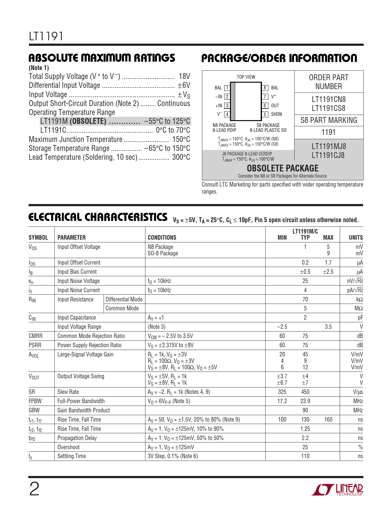 –55°C to 125°C S8 PART MARKING N8 PACKAGE S8 PACKAGE LT1191C ... 0°C to 70°C 8-LEAD PDIP 8-LEAD PLASTIC SO 1191 Maximum Junction Temperature ... 150°C TJMAX = 150°C, θJA = 100°C/W (N8) T Storage Temperature Range ... –65°C to 150°C JMAX = 150°C, θJA = 150°C/W (S8) LT1191MJ8 Lead Temperature (Soldering, 10 sec)... 300°C J8 PACKAGE 8-LEAD CERDIP LT1191CJ8 TJMAX = 150°C, θJA = 100°C/W