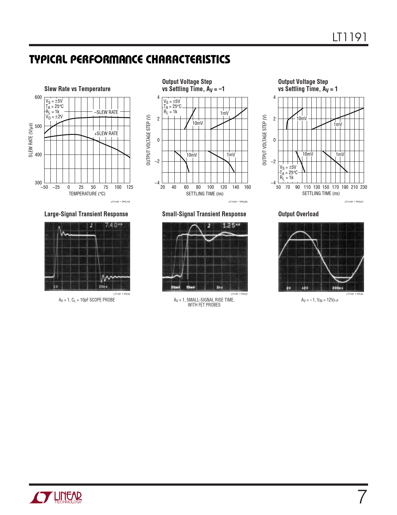 LT1191 • TPC22 LT1191 • TPC23 LT1191 • TPC24 AV = 1, CL = 10pF SCOPE PROBE A A V = 1, SMALL-SIGNAL RISE TIME, V = – 1, VIN = 12VP-P WITH FET PROBES 7