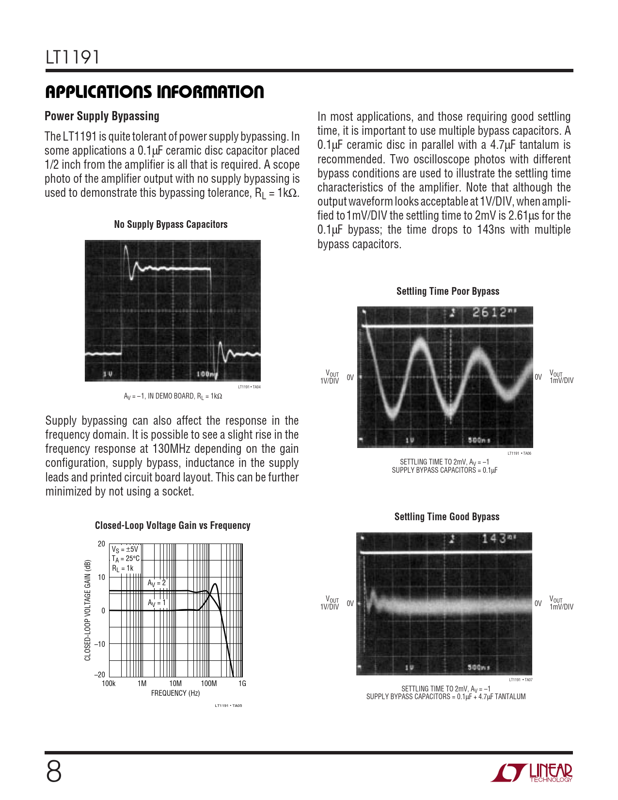 20 VS = ±5V TA = 25°C RL = 1k 10 A = 2 V V V A = 1 OUT OUT V 0V 1V/DIV 0V 1mV/DIV 0 –10 CLOSED-LOOP VOLTAGE GAIN (dB) –20 LT1191 • TA07 100k 1M 10M 100M 1G SETTLING TIME TO 2mV, A FREQUENCY (Hz) V = –1 SUPPLY BYPASS CAPACITORS = 0.1µF + 4.7µF TANTALUM LT1191 • TA05 8