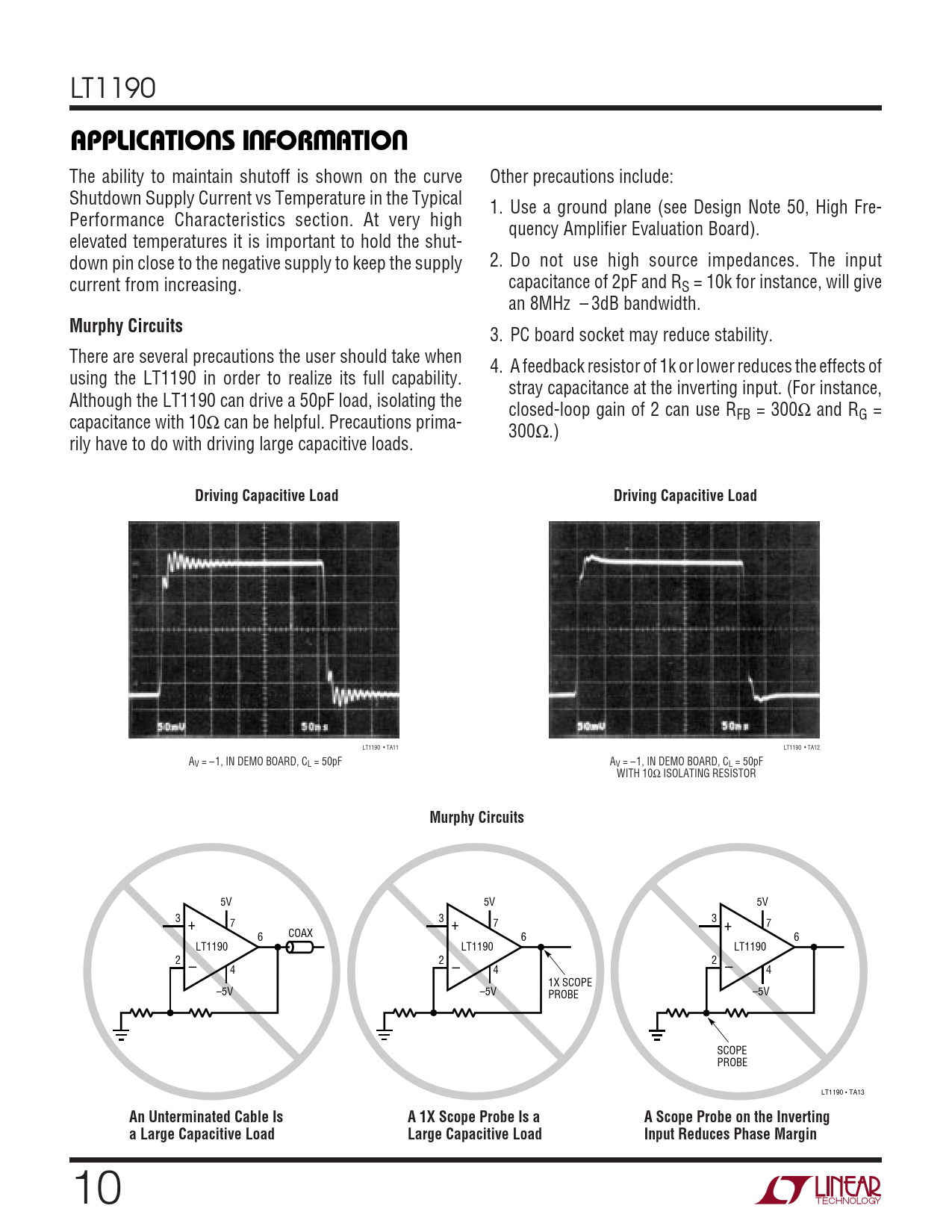 3. PC board socket may reduce stability. There are several precautions the user should take when 4. A feedback resistor of 1k or lower reduces the effects of using the LT1190 in order to realize its full capability. stray capacitance at the inverting input. (For instance, Although the LT1190 can drive a 50pF load, isolating the closed-loop gain of 2 can use R capacitance with 10Ω can be helpful. Precautions prima- FB = 300Ω and RG = 300Ω.) rily have to do with driving large capacitive loads.