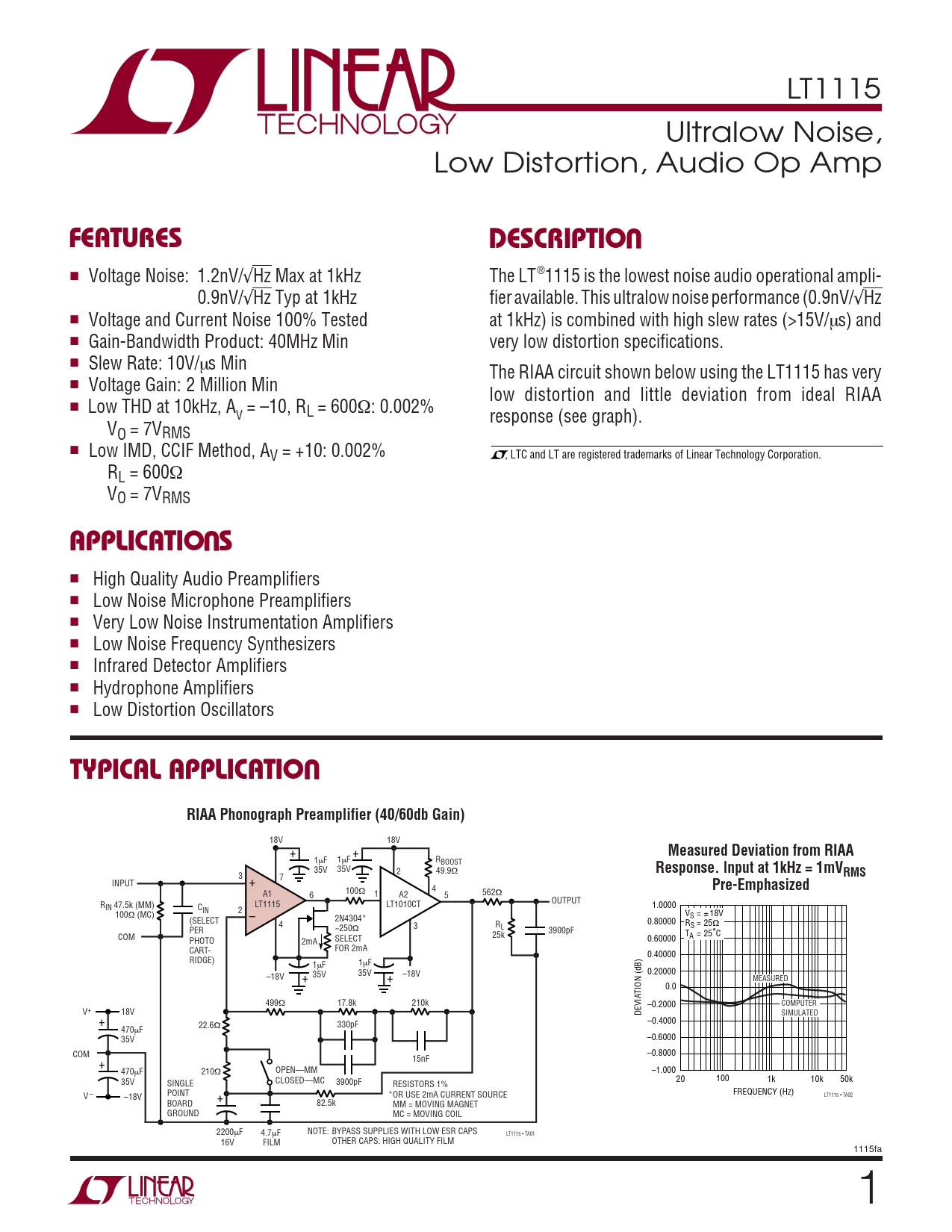 LT1115 Ultralow Noise, Low Distortion, Audio Op Amp UFEATURESDESCRIPTIO ■ Voltage Noise: 1.2nV/√Hz Max at 1kHz The LT®1115 is the lowest noise audio operational ampli- 0.9nV/√Hz Typ at 1kHz fier available. This ultralow noise performance (0.9nV/√Hz ■ Voltage and Current Noise 100% Tested at 1kHz) is combined with high slew rates (>15V/µs) and ■ Gain-Bandwidth Product: 40MHz Min very low distortion specifications. ■ Slew Rate: 10V/µs Min The RIAA circuit shown below using the LT1115 has very ■ Voltage Gain: 2 Million Min low distortion and little deviation from ideal RIAA ■ Low THD at 10kHz, A = –10, R V L = 600Ω: 0.002% response (see graph). VO = 7VRMS ■ Low IMD, CCIF Method, AV = +10: 0.002% , LTC and LT are registered trademarks of Linear Technology Corporation. RL = 600Ω VO = 7VRMS UAPPLICATIO S ■ High Quality Audio Preamplifiers ■ Low Noise Microphone Preamplifiers ■ Very Low Noise Instrumentation Amplifiers ■ Low Noise Frequency Synthesizers ■ Infrared Detector Amplifiers ■ Hydrophone Amplifiers ■ Low Distortion Oscillators UTYPICAL APPLICATIORIAA Phonograph Preamplifier (40/60db Gain) 18V 18V + + Measured Deviation from RIAA 1µF 1µF RBOOST 35V 35V 2 49.9Ω Response. lnput at 1kHz = 1mVRMS 3 7 INPUT + 4 Pre-Emphasized 100 A1 6 Ω 1 562 A2 Ω 5 OUTPUT R LT1115 LT1010CT 1.0000 IN 47.5k (MM) CIN 2 V 100Ω (MC) S = ± 18V – (SELECT 2N4304* 0.80000 4 R R 3 L S = 25Ω PER ~250Ω 3900pF 25k T COM SELECT 0.60000 A = 25°C PHOTO 2mA CART- FOR 2mA 0.40000 RIDGE) 1µF 1µF + 35V + 0.20000 –18V 35V –18V MEASURED 0.0 499Ω 17.8k 210k –0.2000 COMPUTER V+ 18V DEVIATION (dB) SIMULATED –0.4000 + 22.6 470 Ω 330pF µF –0.6000 35V COM –0.8000 15nF + OPEN—MM –1.000 470µF 210Ω 20 100 CLOSED—MC 1k 10k 50k 35V SINGLE 3900pF RESISTORS 1% POINT FREQUENCY (Hz) *OR USE 2mA CURRENT SOURCE LT1115 • TA02 V – –18V + BOARD 82.5k MM = MOVING MAGNET GROUND MC = MOVING COIL 2200µF 4.7µF NOTE: BYPASS SUPPLIES WITH LOW ESR CAPS LT1115 • TA01 16V FILM OTHER CAPS: HIGH QUALITY FILM 1115fa 1