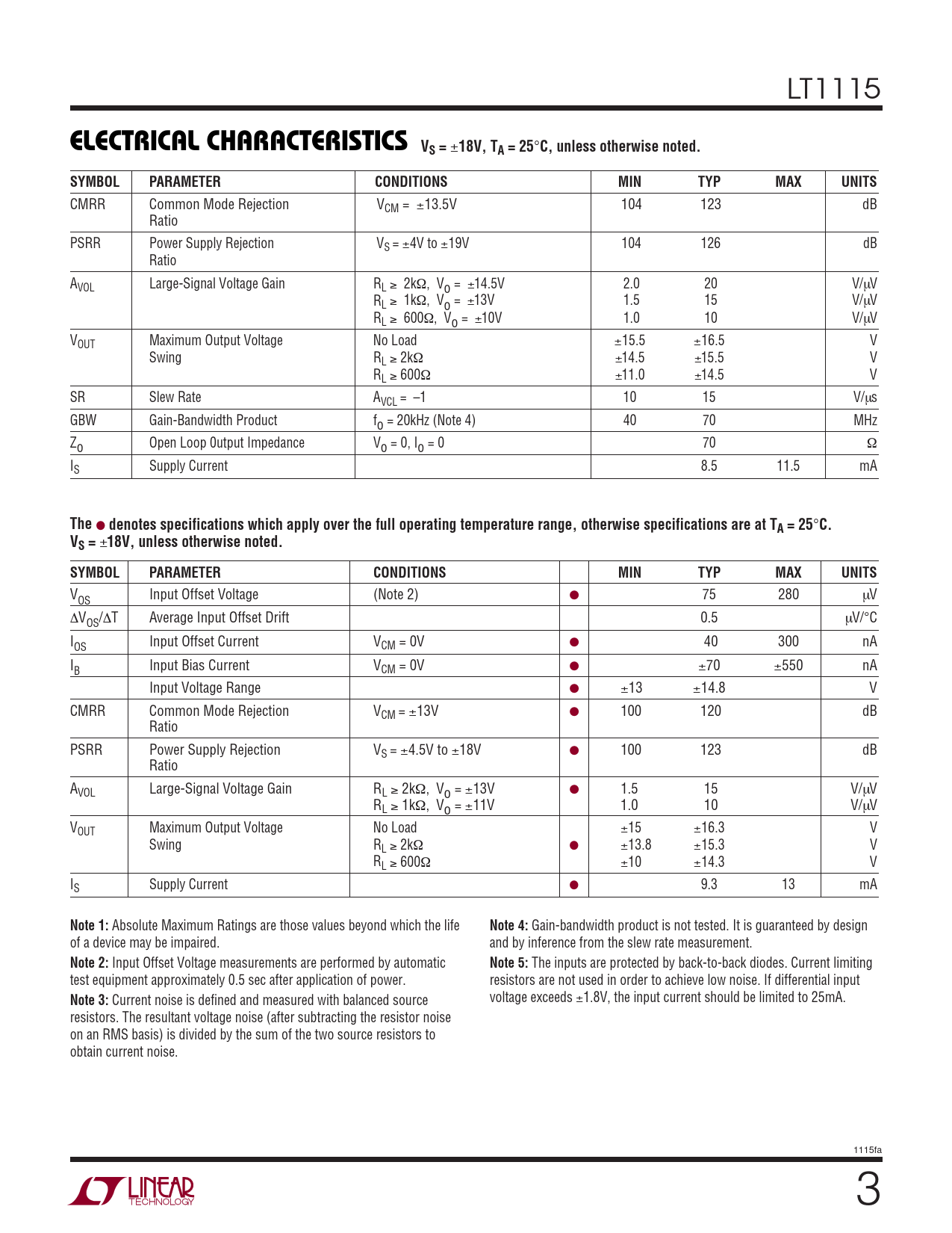 LT1115 ELECTRICAL CHARACTERISTICS VS = ± 18V, TA = 25 ° C, unless otherwise noted.SYMBOLPARAMETERCONDITIONSMINTYPMAXUNITS CMRR Common Mode Rejection VCM = ±13.5V 104 123 dB Ratio PSRR Power Supply Rejection VS = ±4V to ±19V 104 126 dB Ratio AVOL Large-Signal Voltage Gain RL ≥ 2kΩ, Vo = ±14.5V 2.0 20 V/µV RL ≥ 1kΩ, Vo = ±13V 1.5 15 V/µV RL ≥ 600Ω, Vo = ±10V 1.0 10 V/µV VOUT Maximum Output Voltage No Load ±15.5 ±16.5 V Swing RL ≥ 2kΩ ±14.5 ±15.5 V RL ≥ 600Ω ±11.0 ±14.5 V SR Slew Rate AVCL = –1 10 15 V/µs GBW Gain-Bandwidth Product fo = 20kHz (Note 4) 40 70 MHz Zo Open Loop 0utput Impedance Vo = 0, Io = 0 70 Ω IS Supply Current 8.5 11.5 mA The ● denotes specifications which apply over the full operating temperature range, otherwise specifications are at TA = 25 ° C.VS = ± 18V, unless otherwise noted.SYMBOLPARAMETERCONDITIONSMINTYPMAXUNITS V Input Offset Voltage (Note 2) ● 75 280 OS µV ∆V / OS ∆T Average Input Offset Drift 0.5 µV/°C I Input Offset Current V OS CM = 0V ● 40 300 nA I Input Bias Current V B CM = 0V ● ±70 ±550 nA Input Voltage Range ● ±13 ±14.8 V CMRR Common Mode Rejection VCM = ±13V ● 100 120 dB Ratio PSRR Power Supply Rejection VS = ±4.5V to ±18V ● 100 123 dB Ratio AVOL Large-Signal Voltage Gain RL ≥ 2kΩ, Vo = ±13V ● 1.5 15 V/µV RL ≥ 1kΩ, Vo = ±11V 1.0 10 V/µV VOUT Maximum Output Voltage No Load ±15 ±16.3 V Swing RL ≥ 2kΩ ● ±13.8 ±15.3 V RL ≥ 600Ω ±10 ±14.3 V IS Supply Current ● 9.3 13 mA Note 1: Absolute Maximum Ratings are those values beyond which the life Note 4: Gain-bandwidth product is not tested. It is guaranteed by design of a device may be impaired. and by inference from the slew rate measurement. Note 2: Input Offset Voltage measurements are performed by automatic Note 5: The inputs are protected by back-to-back diodes. Current limiting test equipment approximately 0.5 sec after application of power. resistors are not used in order to achieve low noise. If differential input Note 3: Current noise is defined and measured with balanced source voltage exceeds ±1.8V, the input current should be limited to 25mA. resistors. The resultant voltage noise (after subtracting the resistor noise on an RMS basis) is divided by the sum of the two source resistors to obtain current noise. 1115fa 3