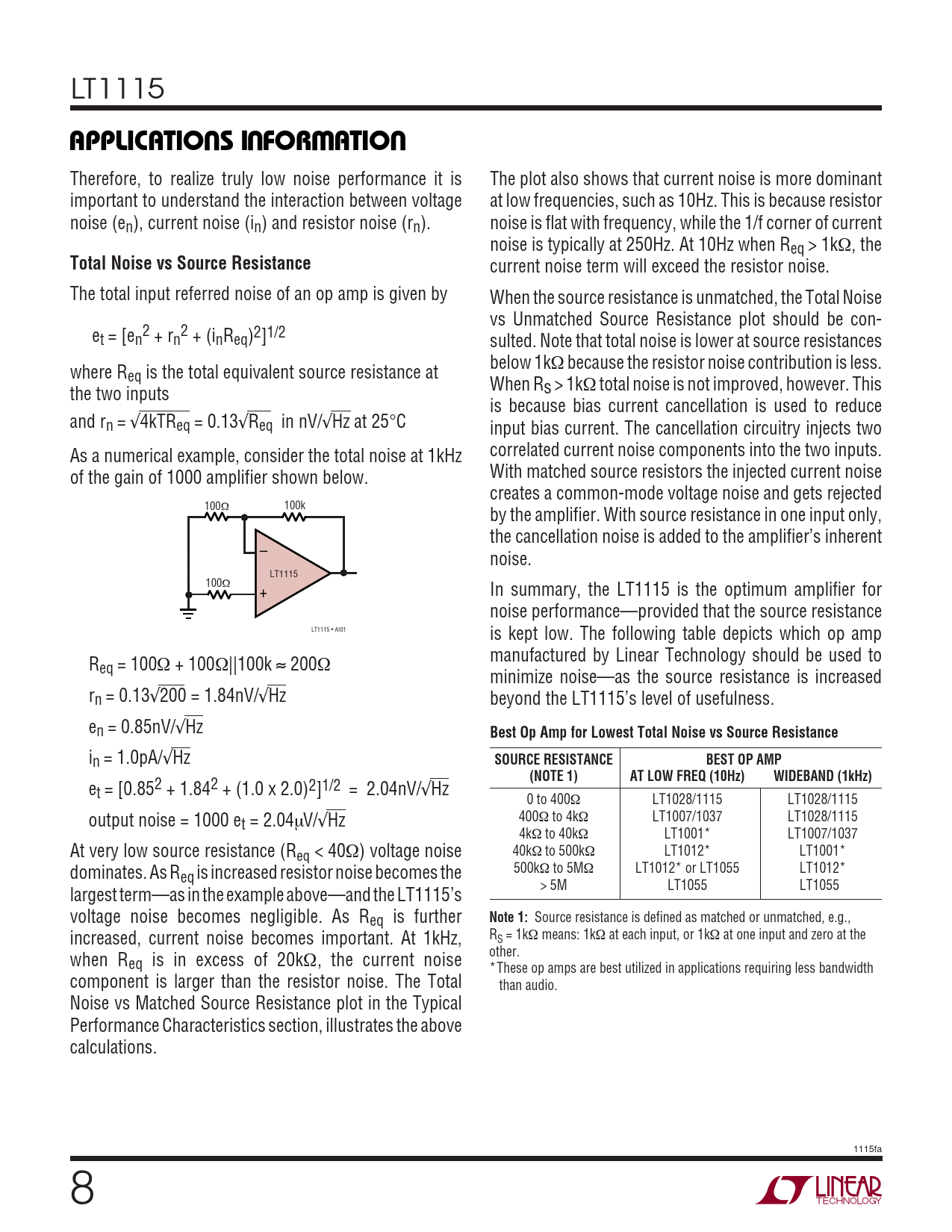 et = [0.852 + 1.842 + (1.0 x 2.0)2]1/2 = 2.04nV/√Hz 0 to 400Ω LT1028/1115 LT1028/1115 output noise = 1000 e 400 t = 2.04µV/√Hz Ω to 4kΩ LT1007/1037 LT1028/1115 4kΩ to 40kΩ LT1001* LT1007/1037 At very low source resistance (Req < 40Ω) voltage noise 40kΩ to 500kΩ LT1012* LT1001* dominates. As R 500kΩ to 5MΩ LT1012* or LT1055 LT1012* eq is increased resistor noise becomes the > 5M LT1055 LT1055 largest term—as in the example above—and the LT1115’s voltage noise becomes negligible. As Req is further