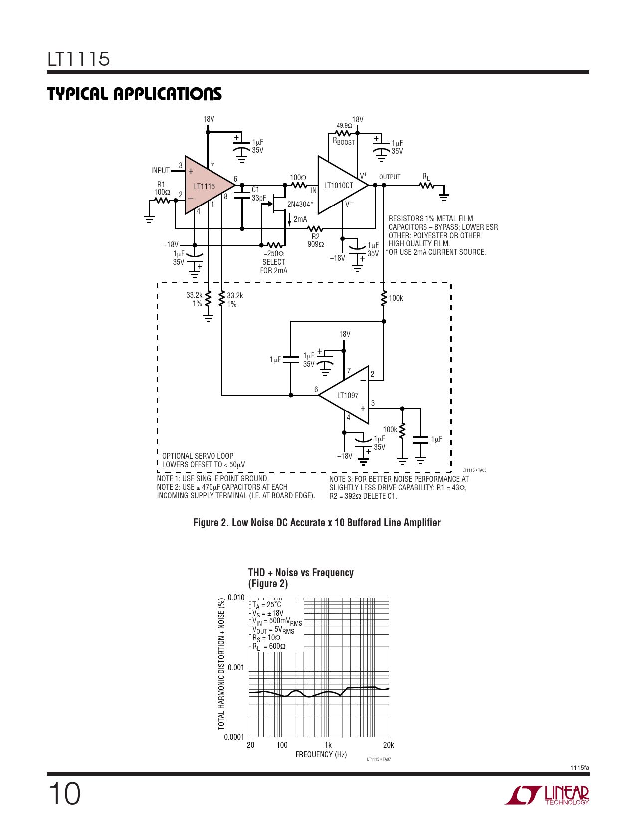 TYPICAL APPLICATIO S. Figure 2. Low Noise DC Accurate x 10 Buffered Line Amplifier. THD + Noise vs Frequency (Figure 2)