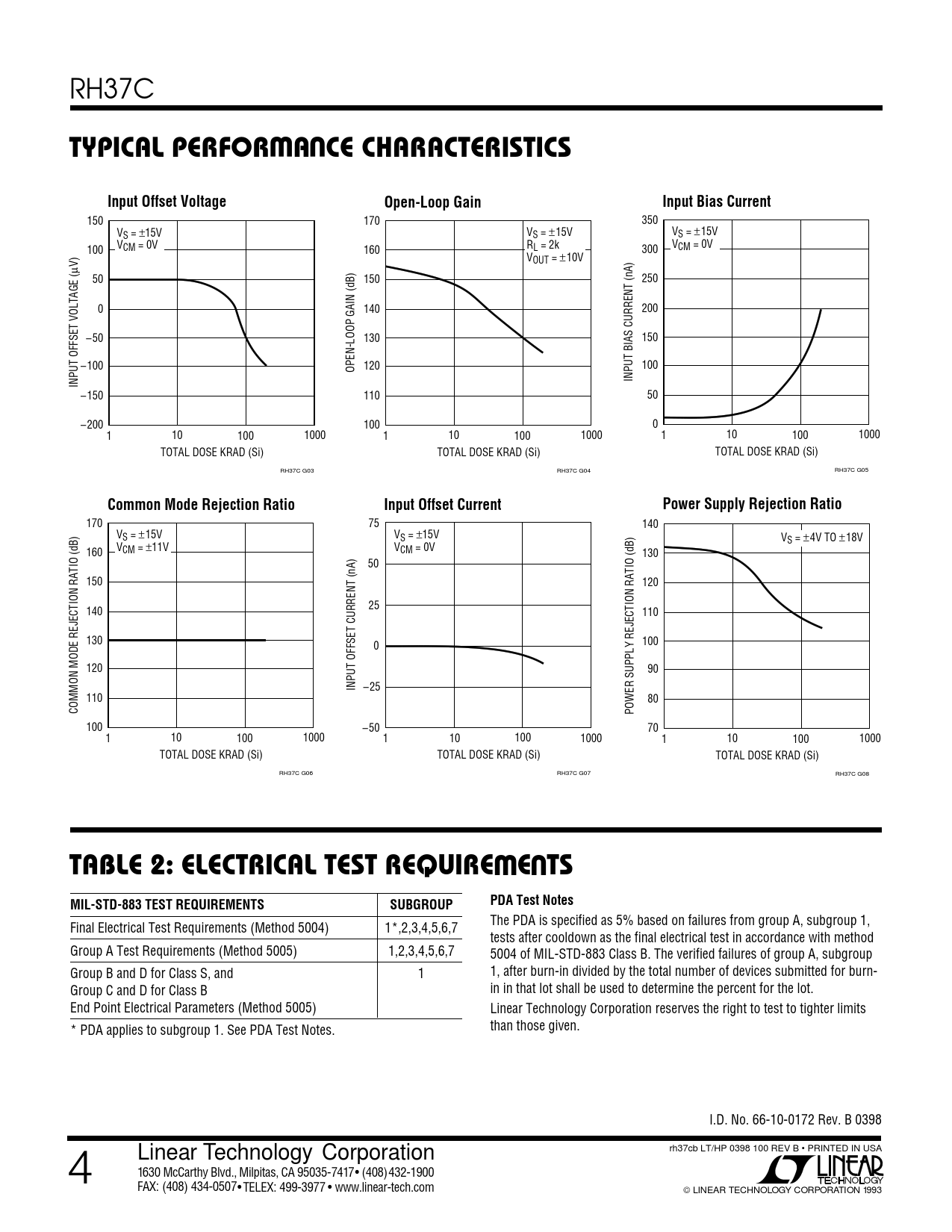 The PDA is specified as 5% based on failures from group A, subgroup 1, Final Electrical Test Requirements (Method 5004) 1*,2,3,4,5,6,7 tests after cooldown as the final electrical test in accordance with method Group A Test Requirements (Method 5005) 1,2,3,4,5,6,7 5004 of MIL-STD-883 Class B. The verified failures of group A, subgroup Group B and D for Class S, and 1 1, after burn-in divided by the total number of devices submitted for burn- Group C and D for Class B in in that lot shall be used to determine the percent for the lot. End Point Electrical Parameters (Method 5005) Linear Technology Corporation reserves the right to test to tighter limits than those given. * PDA applies to subgroup 1. See PDA Test Notes. I.D. No. 66-10-0172 Rev. B 0398 rh37cb LT/HP 0398 100 REV B • PRINTED IN USA 4 Linear Technology Corporation 1630 McCarthy Blvd., Milpitas, CA 95035-7417 ● (408) 432-1900 FAX: (408) 434-0507 ● TELEX: 499-3977 ● www.linear-tech.com LINEAR TECHNOLOGY CORPORATION 1993