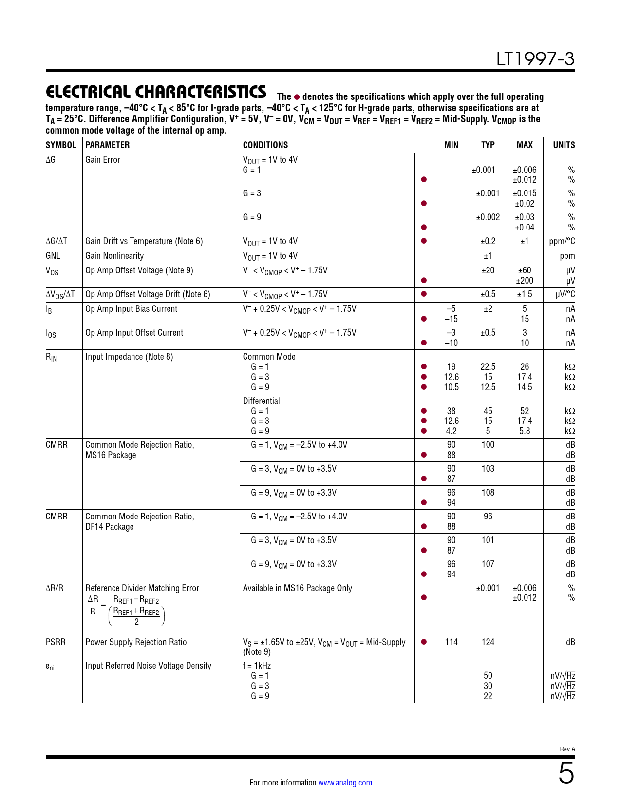 denotes the specifications which apply over the full operating temperature range, –40°C < TA < 85°C for I-grade parts, –40°C < TA < 125°C for H-grade parts, otherwise specifications are at TA = 25°C. Difference Amplifier Configuration, V+ = 5V, V– = 0V, VCM = VOUT = VREF = VREF1 = VREF2 = Mid-Supply. VCMOP is the common mode voltage of the internal op amp. SYMBOL PARAMETER CONDITIONS MIN TYP MAX UNITS