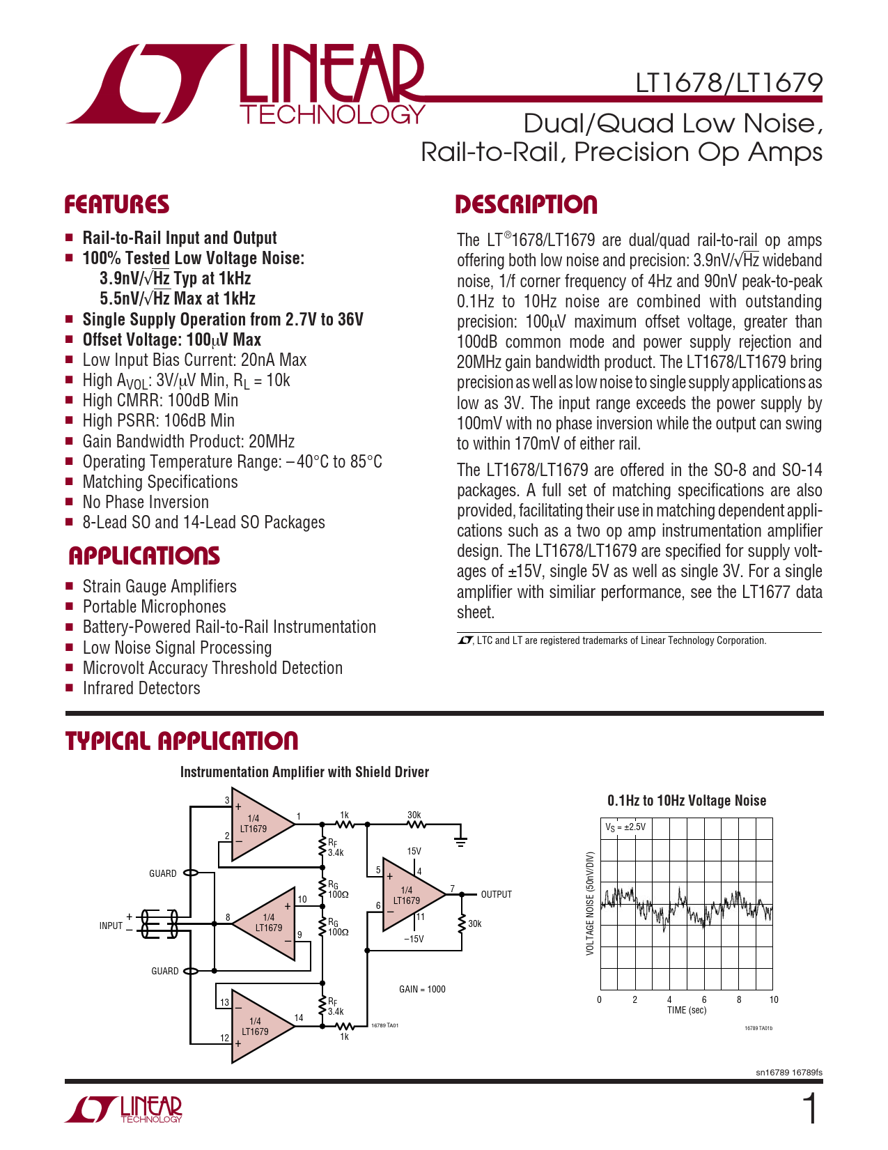 LT1678/LT1679 Dual/Quad Low Noise, Rail-to-Rail, Precision Op Amps UFEATURESDESCRIPTIO ■ Rail-to-Rail Input and Output The LT®1678/LT1679 are dual/quad rail-to-rail op amps ■ 100% Tested Low Voltage Noise: offering both low noise and precision: 3.9nV/√Hz wideband 3.9nV/ √ Hz Typ at 1kHz noise, 1/f corner frequency of 4Hz and 90nV peak-to-peak 5.5nV/ √ Hz Max at 1kHz 0.1Hz to 10Hz noise are combined with outstanding ■ Single Supply Operation from 2.7V to 36V precision: 100µV maximum offset voltage, greater than ■ Offset Voltage: 100 µ V Max 100dB common mode and power supply rejection and ■ Low Input Bias Current: 20nA Max 20MHz gain bandwidth product. The LT1678/LT1679 bring ■ High AVOL: 3V/µV Min, RL = 10k precision as well as low noise to single supply applications as ■ High CMRR: 100dB Min low as 3V. The input range exceeds the power supply by ■ High PSRR: 106dB Min 100mV with no phase inversion while the output can swing ■ Gain Bandwidth Product: 20MHz to within 170mV of either rail. ■ Operating Temperature Range: – 40°C to 85°C The LT1678/LT1679 are offered in the SO-8 and SO-14 ■ Matching Specifications packages. A full set of matching specifications are also ■ No Phase Inversion provided, facilitating their use in matching dependent appli- ■ 8-Lead SO and 14-Lead SO Packages U cations such as a two op amp instrumentation amplifier APPLICATIO S design. The LT1678/LT1679 are specified for supply volt- ages of ±15V, single 5V as well as single 3V. For a single ■ Strain Gauge Amplifiers amplifier with similiar performance, see the LT1677 data ■ Portable Microphones sheet. ■ Battery-Powered Rail-to-Rail Instrumentation ■ Low Noise Signal Processing , LTC and LT are registered trademarks of Linear Technology Corporation. ■ Microvolt Accuracy Threshold Detection ■ Infrared Detectors UTYPICAL APPLICATIOInstrumentation Amplifier with Shield Driver 3 0.1Hz to 10Hz Voltage Noise + 1/4 1 1k 30k LT1679 VS = ±2.5V 2 – RF 3.4k 15V 5 4 GUARD + RG 1/4 7 100Ω OUTPUT + 10 LT1679 6 + – 8 1/4 11 RG 30k INPUT LT1679 – 100Ω – 9 –15V VOLTAGE NOISE (50nV/DIV) GUARD GAIN = 1000 13 R 0 2 4 6 8 10 – F 3.4k TIME (sec) 1/4 14 16789 TA01 LT1679 16789 TA01b 12 + 1k sn16789 16789fs 1