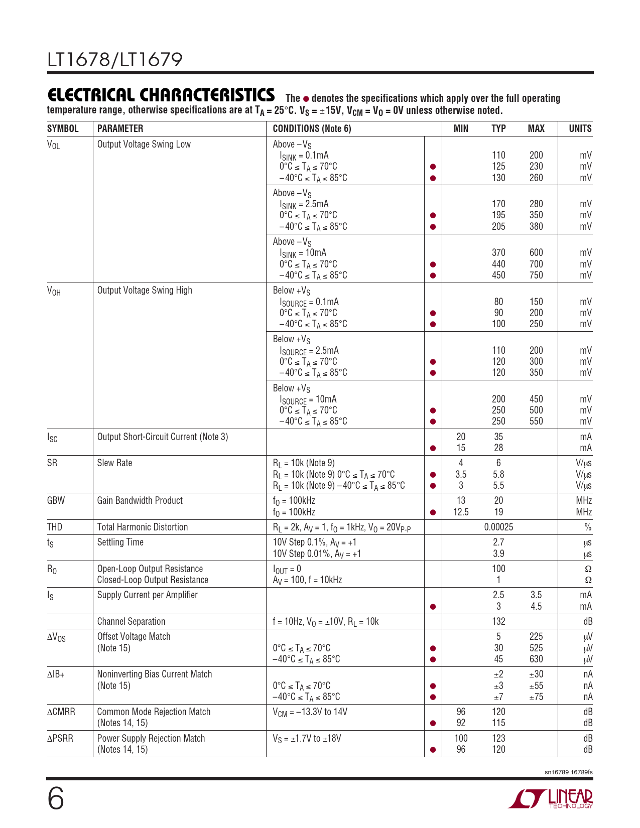 VOL Output Voltage Swing Low Above – VS ISINK = 0.1mA 110 200 mV 0°C ≤ TA ≤ 70°C ● 125 230 mV – 40°C ≤ TA ≤ 85°C ● 130 260 mV Above – VS ISINK = 2.5mA 170 280 mV 0°C ≤ TA ≤ 70°C ● 195 350 mV – 40°C ≤ TA ≤ 85°C ● 205 380 mV Above – VS ISINK = 10mA 370 600 mV 0°C ≤ TA ≤ 70°C ● 440 700 mV – 40°C ≤ TA ≤ 85°C ● 450 750 mV VOH Output Voltage Swing High Below +VS ISOURCE = 0.1mA 80 150 mV 0°C ≤ TA ≤ 70°C ● 90 200 mV – 40°C ≤ TA ≤ 85°C ● 100 250 mV Below +VS ISOURCE = 2.5mA 110 200 mV 0°C ≤ TA ≤ 70°C ● 120 300 mV – 40°C ≤ TA ≤ 85°C ● 120 350 mV Below +VS ISOURCE = 10mA 200 450 mV 0°C ≤ TA ≤ 70°C ● 250 500 mV – 40°C ≤ TA ≤ 85°C ● 250 550 mV ISC Output Short-Circuit Current (Note 3) 20 35 mA ● 15 28 mA SR Slew Rate RL = 10k (Note 9) 4 6 V/µs RL = 10k (Note 9) 0°C ≤ TA ≤ 70°C ● 3.5 5.8 V/µs RL = 10k (Note 9) – 40°C ≤ TA ≤ 85°C ● 3 5.5 V/µs GBW Gain Bandwidth Product fO = 100kHz 13 20 MHz fO = 100kHz ● 12.5 19 MHz THD Total Harmonic Distortion RL = 2k, AV = 1, fO = 1kHz, VO = 20VP-P 0.00025 % tS Settling Time 10V Step 0.1%, AV = +1 2.7 µs 10V Step 0.01%, AV = +1 3.9 µs RO Open-Loop Output Resistance IOUT = 0 100 Ω Closed-Loop Output Resistance AV = 100, f = 10kHz 1 Ω IS Supply Current per Amplifier 2.5 3.5 mA ● 3 4.5 mA Channel Separation f = 10Hz, VO = ±10V, RL = 10k 132 dB ∆VOS Offset Voltage Match 5 225 µV (Note 15) 0°C ≤ TA ≤ 70°C ● 30 525 µV –40°C ≤ TA ≤ 85°C ● 45 630 µV ∆IB+ Noninverting Bias Current Match ±2 ±30 nA (Note 15) 0°C ≤ TA ≤ 70°C ● ±3 ±55 nA –40°C ≤ TA ≤ 85°C ● ±7 ±75 nA ∆CMRR Common Mode Rejection Match VCM = –13.3V to 14V 96 120 dB (Notes 14, 15) ● 92 115 dB ∆PSRR Power Supply Rejection Match VS = ±1.7V to ±18V 100 123 dB (Notes 14, 15) ● 96 120 dB sn16789 16789fs 6