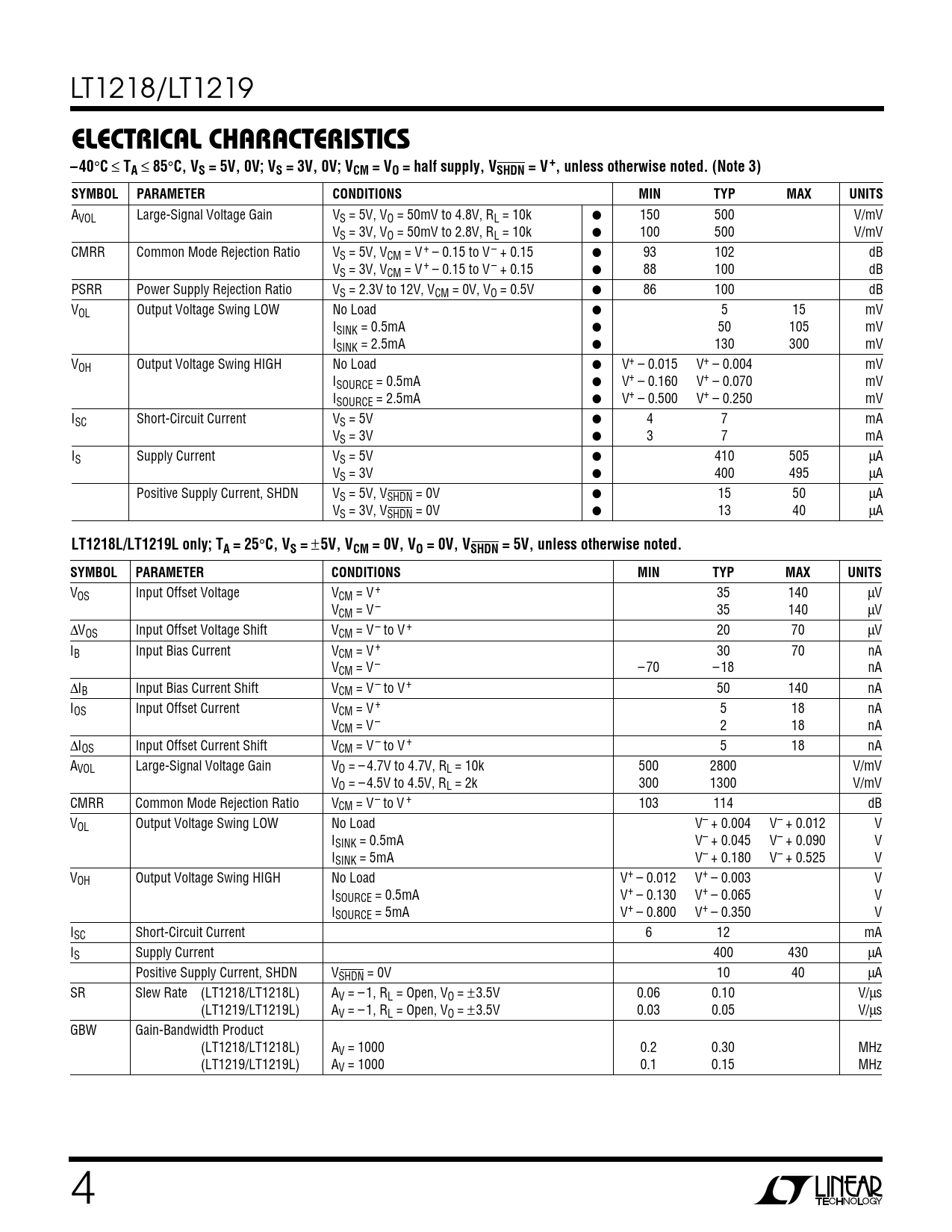 VOS Input Offset Voltage VCM = V+ 35 140 µV VCM = V– 35 140 µV ∆VOS Input Offset Voltage Shift VCM = V– to V + 20 70 µV IB Input Bias Current VCM = V + 30 70 nA VCM = V– – 70 – 18 nA ∆IB Input Bias Current Shift VCM = V – to V+ 50 140 nA IOS Input Offset Current VCM = V + 5 18 nA VCM = V– 2 18 nA ∆IOS Input Offset Current Shift VCM = V – to V + 5 18 nA AVOL Large-Signal Voltage Gain VO = – 4.7V to 4.7V, RL = 10k 500 2800 V/mV VO = – 4.5V to 4.5V, RL = 2k 300 1300 V/mV CMRR Common Mode Rejection Ratio VCM = V– to V + 103 114 dB VOL Output Voltage Swing LOW No Load V– + 0.004 V– + 0.012 V ISINK = 0.5mA V– + 0.045 V– + 0.090 V ISINK = 5mA V– + 0.180 V– + 0.525 V VOH Output Voltage Swing HIGH No Load V+ – 0.012 V+ – 0.003 V ISOURCE = 0.5mA V+ – 0.130 V+ – 0.065 V ISOURCE = 5mA V+ – 0.800 V+ – 0.350 V ISC Short-Circuit Current 6 12 mA IS Supply Current 400 430 µA Positive Supply Current, SHDN VSHDN = 0V 10 40 µA SR Slew Rate (LT1218/LT1218L) AV = – 1, RL = Open, VO = ±3.5V 0.06 0.10 V/µs (LT1219/LT1219L) AV = – 1, RL = Open, VO = ±3.5V 0.03 0.05 V/µs GBW Gain-Bandwidth Product (LT1218/LT1218L) AV = 1000 0.2 0.30 MHz (LT1219/LT1219L) AV = 1000 0.1 0.15 MHz 4