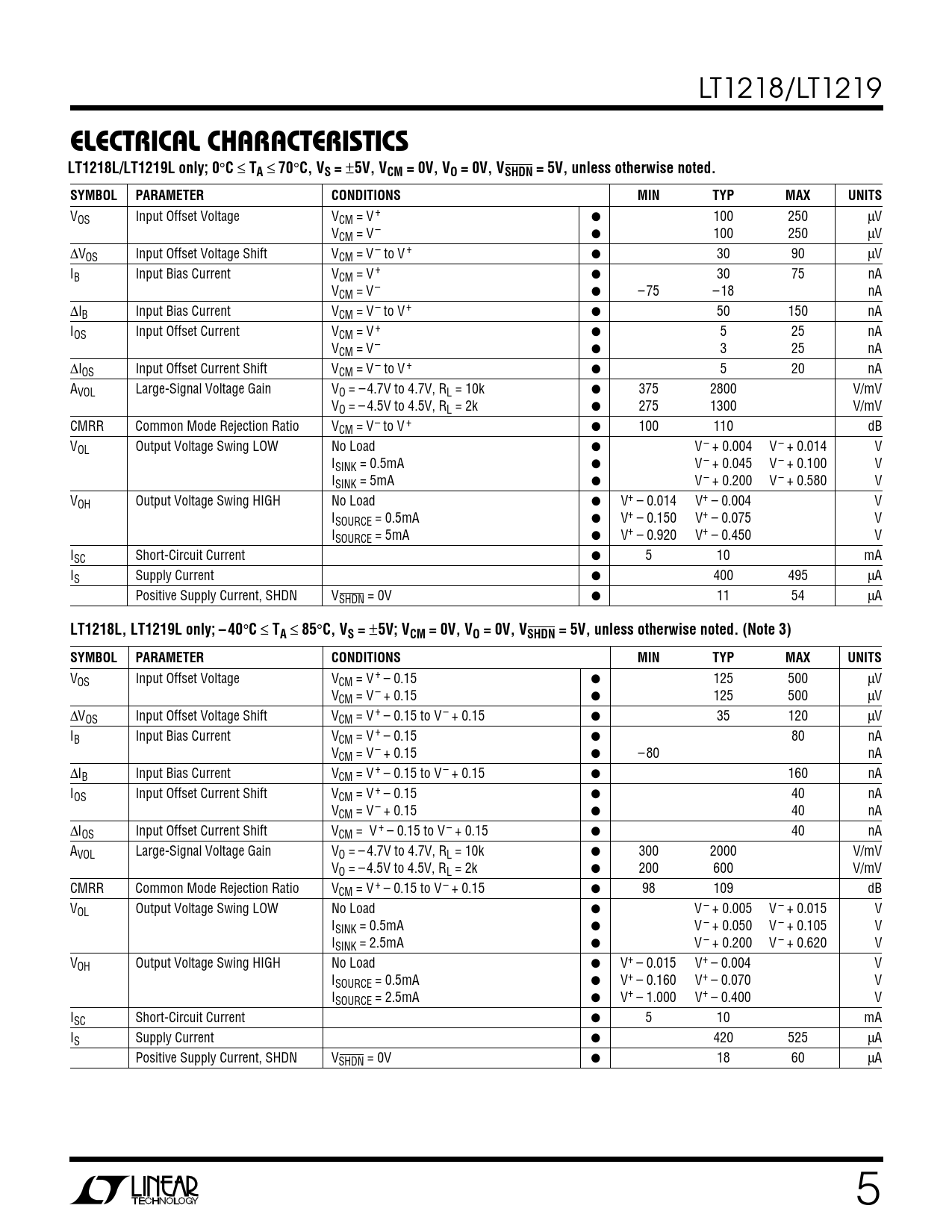 | Seiten / Seite | 16 / 5 — ELECTRICAL CHARACTERISTICS. LT1218L/LT1219L only; 0. C, VS =. 5V, VCM = … |
