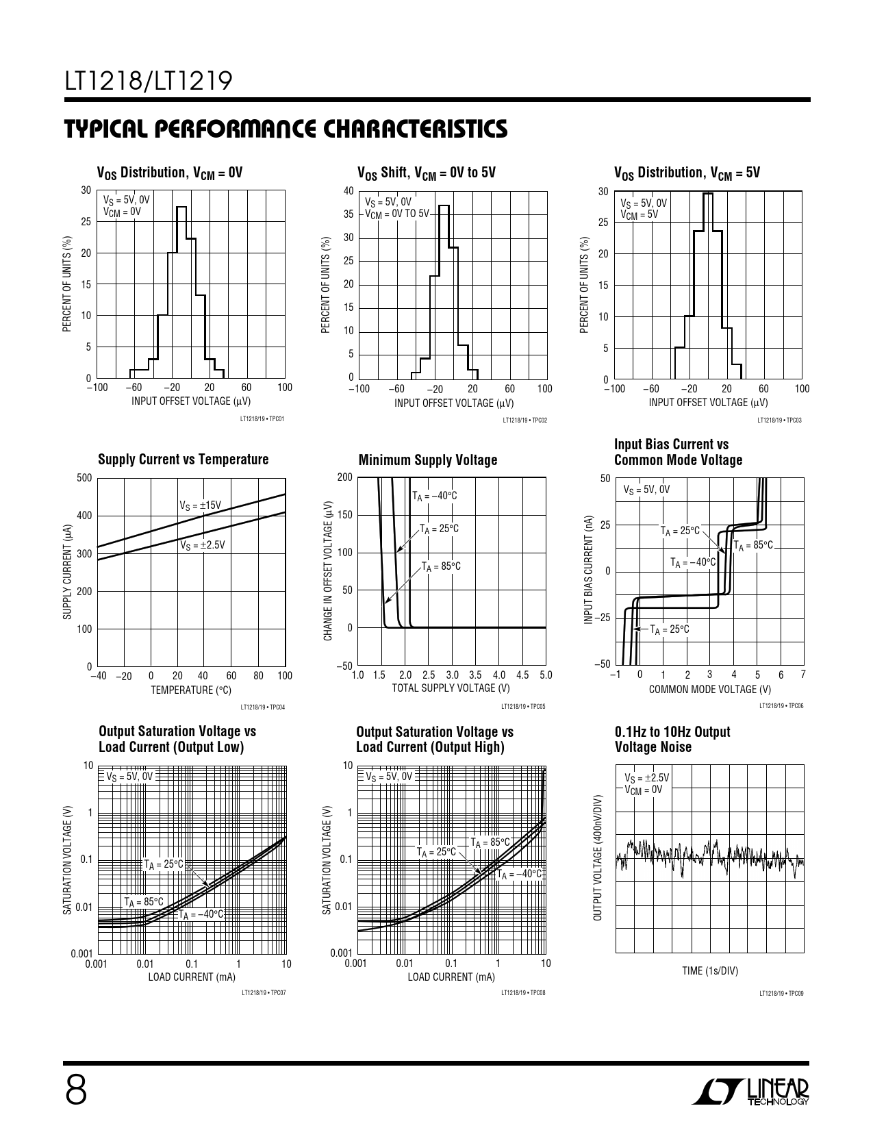 30 40 30 VS = 5V, 0V VS = 5V, 0V VS = 5V, 0V VCM = 0V 35 VCM = 0V TO 5V VCM = 5V 25 25 30 20 20 25 15 20 15 15 10 10 PERCENT OF UNITS (%) PERCENT OF UNITS (%) 10 PERCENT OF UNITS (%) 5 5 5 0 0 0 –100 –60 –20 20 60 100 –100 –60 –20 20 60 100 –100 –60 –20 20 60 100 INPUT OFFSET VOLTAGE (µV) INPUT OFFSET VOLTAGE (µV) INPUT OFFSET VOLTAGE (µV) LT1218/19 • TPC01 LT1218/19 • TPC02 LT1218/19 • TPC03