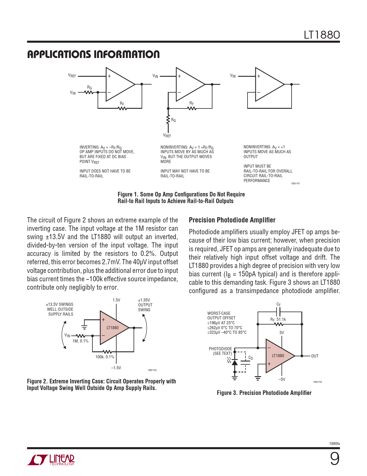 LT1880 APPLICATIONS INFORMATION VREF + VIN + VIN + RG VIN – – – RF RF RG VREF INVERTING: AV = –RF/RG NONINVERTING: AV = 1 +RF/RG NONINVERTING: AV = +1 OP AMP INPUTS DO NOT MOVE, INPUTS MOVE BY AS MUCH AS INPUTS MOVE AS MUCH AS BUT ARE FIXED AT DC BIAS VIN, BUT THE OUTPUT MOVES OUTPUT POINT VREF MORE INPUT MUST BE INPUT DOES NOT HAVE TO BE INPUT MAY NOT HAVE TO BE RAIL-TO-RAIL FOR OVERALL RAIL-TO-RAIL RAIL-TO-RAIL CIRCUIT RAIL-TO-RAIL PERFORMANCE 1880 F01 Figure 1. Some Op Amp Confi gurations Do Not Require Rail-to Rail Inputs to Achieve Rail-to-Rail Outputs The circuit of Figure 2 shows an extreme example of the Precision Photodiode Amplifier inverting case. The input voltage at the 1M resistor can Photodiode amplifiers usually employ JFET op amps be- swing ±13.5V and the LT1880 will output an inverted, cause of their low bias current; however, when precision divided-by-ten version of the input voltage. The input is required, JFET op amps are generally inadequate due to accuracy is limited by the resistors to 0.2%. Output their relatively high input offset voltage and drift. The referred, this error becomes 2.7mV. The 40μV input offset LT1880 provides a high degree of precision with very low voltage contribution, plus the additional error due to input bias current (I bias current times the ~100k effective source impedance, B = 150pA typical) and is therefore appli- cable to this demanding task. Figure 3 shows an LT1880 contribute only negligibly to error. configured as a transimpedance photodiode amplifier. 1.5V ±1.35V ±13.5V SWINGS OUTPUT CF WELL OUTSIDE SWING SUPPLY RAILS WORST-CASE + OUTPUT OFFSET RF 51.1k ≤196μV AT 25°C LT1880 ≤262μV 0°C TO 70°C ≤323μV –40°C TO 85°C 5V VIN – 1M, 0.1% – PHOTODIODE (SEE TEXT) 100k, 0.1% LT1880 OUT CD + –1.5V 1880 F02 –5V Figure 2. Extreme Inverting Case: Circuit Operates Properly with 1880 F02 Input Voltage Swing Well Outside Op Amp Supply Rails.Figure 3. Precision Photodiode Amplifi er 1880fa 9