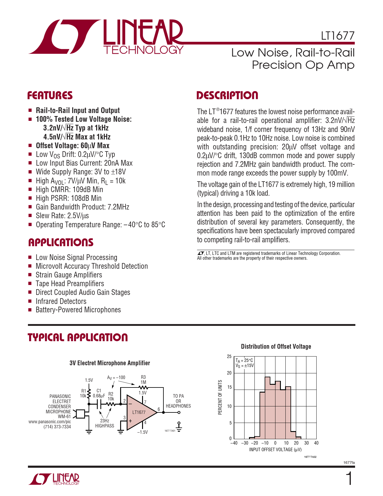 LT1677 Low Noise, Rail-to-Rail Precision Op Amp UFEATURESDESCRIPTIO ■ Rail-to-Rail Input and Output The LT®1677 features the lowest noise performance avail- ■ 100% Tested Low Voltage Noise: able for a rail-to-rail operational amplifier: 3.2nV/√Hz 3.2nV/ √ Hz Typ at 1kHz wideband noise, 1/f corner frequency of 13Hz and 90nV 4.5nV/ √ Hz Max at 1kHz peak-to-peak 0.1Hz to 10Hz noise. Low noise is combined ■ Offset Voltage: 60 µ V Max with outstanding precision: 20µV offset voltage and ■ Low VOS Drift: 0.2µV/°C Typ 0.2µV/°C drift, 130dB common mode and power supply ■ Low Input Bias Current: 20nA Max rejection and 7.2MHz gain bandwidth product. The com- ■ Wide Supply Range: 3V to ±18V mon mode range exceeds the power supply by 100mV. ■ High AVOL: 7V/µV Min, RL = 10k The voltage gain of the LT1677 is extremely high, 19 million ■ High CMRR: 109dB Min (typical) driving a 10k load. ■ High PSRR: 108dB Min ■ Gain Bandwidth Product: 7.2MHz In the design, processing and testing of the device, particular ■ Slew Rate: 2.5V/µs attention has been paid to the optimization of the entire ■ Operating Temperature Range: – 40°C to 85°C distribution of several key parameters. Consequently, the specifications have been spectacularly improved compared U to competing rail-to-rail amplifiers. APPLICATIO S , LT, LTC and LTM are registered trademarks of Linear Technology Corporation. ■ Low Noise Signal Processing All other trademarks are the property of their respective owners. ■ Microvolt Accuracy Threshold Detection ■ Strain Gauge Amplifiers ■ Tape Head Preamplifiers ■ Direct Coupled Audio Gain Stages ■ Infrared Detectors ■ Battery-Powered Microphones UTYPICAL APPLICATIODistribution of Offset Voltage 25 3V Electret Microphone Amplifier TA = 25°C VS = ±15V 20 A R3 V = –100 1.5V 1M 15 R1 C1 R2 1.5V PANASONIC 10k 0.68µF TO PA 10k ELECTRET 2 – OR 7 CONDENSER HEADPHONES 10 6 MICROPHONE LT1677 PERCENT OF UNITS WM-61 3 + www.panasonic.com/pic 23Hz 4 5 (714) 373-7334 HIGHPASS –1.5V 1677 TA01 0 –40 –30 –20 –10 0 10 20 30 40 INPUT OFFSET VOLTAGE (µV) 1677 TA02 1677fa 1