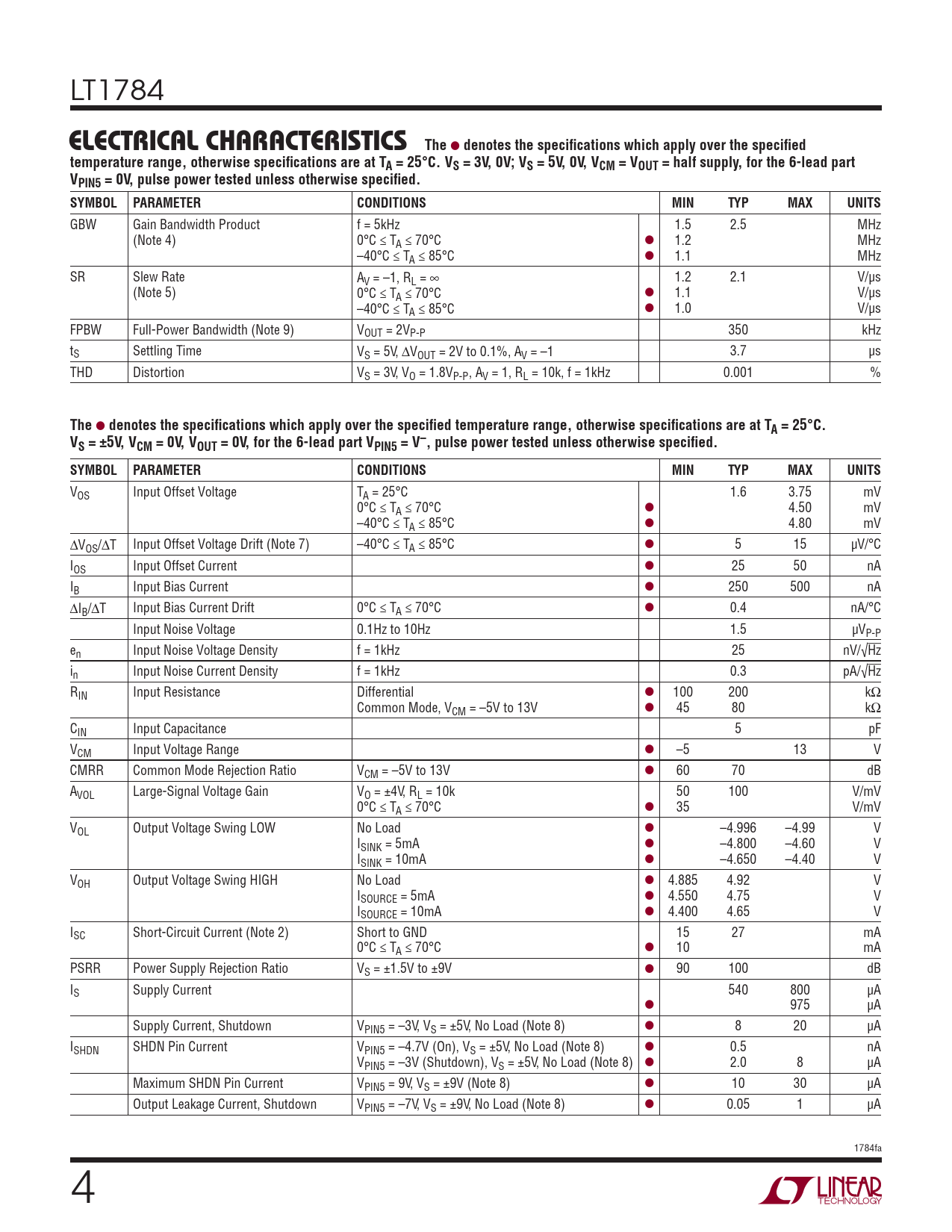 VOS Input Offset Voltage TA = 25°C 1.6 3.75 mV 0°C ≤ TA ≤ 70°C l 4.50 mV –40°C ≤ TA ≤ 85°C l 4.80 mV ΔVOS/ΔT Input Offset Voltage Drift (Note 7) –40°C ≤ TA ≤ 85°C l 5 15 μV/°C IOS Input Offset Current l 25 50 nA IB Input Bias Current l 250 500 nA ΔIB/ΔT Input Bias Current Drift 0°C ≤ TA ≤ 70°C l 0.4 nA/°C Input Noise Voltage 0.1Hz to 10Hz 1.5 μVP-P en Input Noise Voltage Density f = 1kHz 25 nV/√Hz in Input Noise Current Density f = 1kHz 0.3 pA/√Hz RIN Input Resistance Differential l 100 200 kΩ Common Mode, VCM = –5V to 13V l 45 80 kΩ CIN Input Capacitance 5 pF VCM Input Voltage Range l –5 13 V CMRR Common Mode Rejection Ratio VCM = –5V to 13V l 60 70 dB AVOL Large-Signal Voltage Gain VO = ±4V, RL = 10k 50 100 V/mV 0°C ≤ TA ≤ 70°C l 35 V/mV VOL Output Voltage Swing LOW No Load l –4.996 –4.99 V ISINK = 5mA l –4.800 –4.60 V ISINK = 10mA l –4.650 –4.40 V VOH Output Voltage Swing HIGH No Load l 4.885 4.92 V ISOURCE = 5mA l 4.550 4.75 V ISOURCE = 10mA l 4.400 4.65 V ISC Short-Circuit Current (Note 2) Short to GND 15 27 mA 0°C ≤ TA ≤ 70°C l 10 mA PSRR Power Supply Rejection Ratio VS = ±1.5V to ±9V l 90 100 dB IS Supply Current 540 800 μA l 975 μA Supply Current, Shutdown VPIN5 = –3V, VS = ±5V, No Load (Note 8) l 8 20 μA ISHDN SHDN Pin Current VPIN5 = –4.7V (On), VS = ±5V, No Load (Note 8) l 0.5 nA VPIN5 = –3V (Shutdown), VS = ±5V, No Load (Note 8) l 2.0 8 μA Maximum SHDN Pin Current VPIN5 = 9V, VS = ±9V (Note 8) l 10 30 μA Output Leakage Current, Shutdown VPIN5 = –7V, VS = ±9V, No Load (Note 8) l 0.05 1 μA 1784fa 4