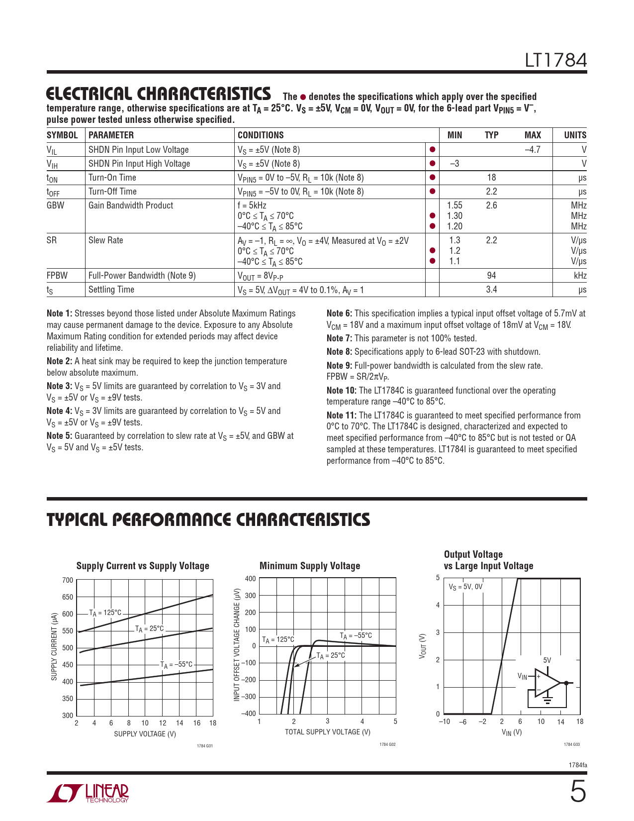 VIL SHDN Pin Input Low Voltage VS = ±5V (Note 8) l –4.7 V VIH SHDN Pin Input High Voltage VS = ±5V (Note 8) l –3 V tON Turn-On Time VPIN5 = 0V to –5V, RL = 10k (Note 8) l 18 μs tOFF Turn-Off Time VPIN5 = –5V to 0V, RL = 10k (Note 8) l 2.2 μs GBW Gain Bandwidth Product f = 5kHz 1.55 2.6 MHz 0°C ≤ TA ≤ 70°C l 1.30 MHz –40°C ≤ TA ≤ 85°C l 1.20 MHz SR Slew Rate AV = –1, RL = ∞, VO = ±4V, Measured at VO = ±2V 1.3 2.2 V/μs 0°C ≤ T l A ≤ 70°C 1.2 V/μs –40°C ≤ T l A ≤ 85°C 1.1 V/μs FPBW Full-Power Bandwidth (Note 9) VOUT = 8VP-P 94 kHz tS Settling Time VS = 5V, ΔVOUT = 4V to 0.1%, AV = 1 3.4 μs