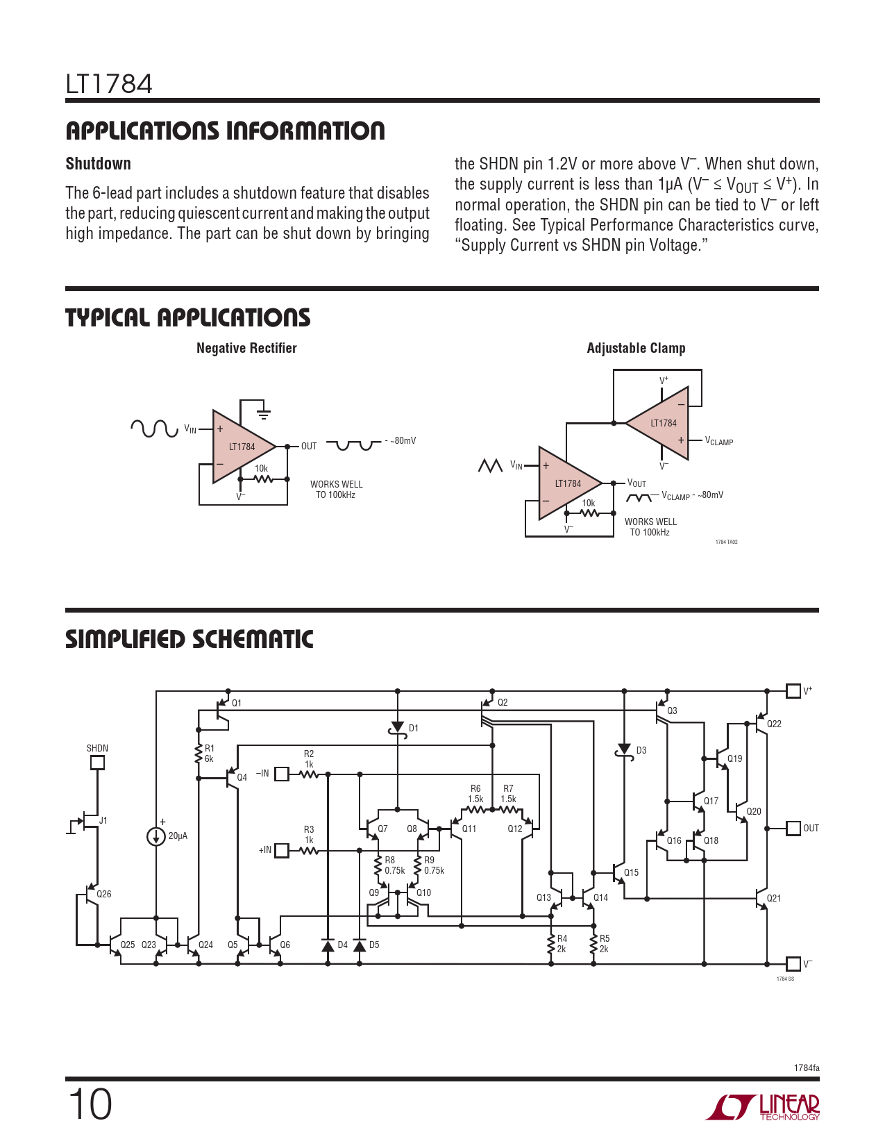 LT1784 APPLICATIONS INFORMATIONShutdown the SHDN pin 1.2V or more above V–. When shut down, the supply current is less than 1μA (V– ≤ V The 6-lead part includes a shutdown feature that disables OUT ≤ V+). In normal operation, the SHDN pin can be tied to V– or left the part, reducing quiescent current and making the output fl oating. See Typical Performance Characteristics curve, high impedance. The part can be shut down by bringing “Supply Current vs SHDN pin Voltage.” TYPICAL APPLICATIONSNegative Rectifi erAdjustable Clamp V+ – LT1784 VIN + + - ~80mV VCLAMP LT1784 OUT – VIN + V– 10k WORKS WELL LT1784 VOUT V– TO 100kHz – VCLAMP - ~80mV 10k WORKS WELL V– TO 100kHz 1784 TA02 SIMPLIFIED SCHEMATIC V+ Q1 Q2 Q3 D1 Q22 SHDN R1 R2 D3 6k Q19 1k –IN Q4 R6 R7 1.5k 1.5k Q17 Q20 J1 + R3 Q7 Q8 Q11 Q12 OUT 20μA 1k Q16 Q18 +IN R8 R9 0.75k 0.75k Q15 Q26 Q9 Q10 Q13 Q14 Q21 R4 R5 Q25 Q23 Q24 Q5 Q6 D4 D5 2k 2k V– 1784 SS 1784fa 10