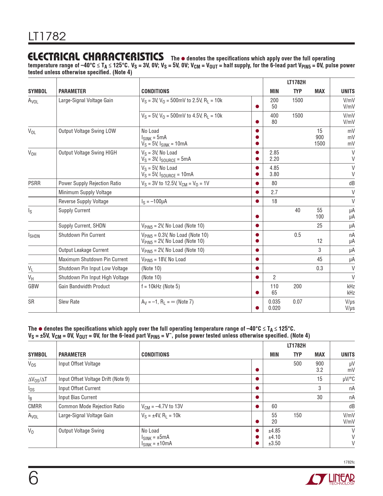 LT1782 ELECTRICAL CHARACTERISTICSThe l denotes the specifications which apply over the full operatingtemperature range of –40°C ≤ TA ≤ 125°C. VS = 3V, 0V; VS = 5V, 0V; VCM = VOUT = half supply, for the 6-lead part VPIN5 = 0V, pulse powertested unless otherwise specified. (Note 4)LT1782HSYMBOLPARAMETERCONDITIONSMINTYPMAXUNITS AVOL Large-Signal Voltage Gain VS = 3V, VO = 500mV to 2.5V, RL = 10k 200 1500 V/mV l 50 V/mV VS = 5V, VO = 500mV to 4.5V, RL = 10k 400 1500 V/mV l 80 V/mV VOL Output Voltage Swing LOW No Load l 15 mV ISINK = 5mA l 900 mV VS = 5V, ISINK = 10mA l 1500 mV VOH Output Voltage Swing HIGH VS = 3V, No Load l 2.85 V VS = 3V, ISOURCE = 5mA l 2.20 V VS = 5V, No Load l 4.85 V VS = 5V, ISOURCE = 10mA l 3.80 V PSRR Power Supply Rejection Ratio VS = 3V to 12.5V, VCM = VO = 1V l 80 dB Minimum Supply Voltage l 2.7 V Reverse Supply Voltage IS = –100µA l 18 V IS Supply Current 40 55 µA l 100 µA Supply Current, SHDN VPIN5 = 2V, No Load (Note 10) l 25 µA ISHDN Shutdown Pin Current VPIN5 = 0.3V, No Load (Note 10) l 0.5 nA VPIN5 = 2V, No Load (Note 10) l 12 µA Output Leakage Current VPIN5 = 2V, No Load (Note 10) l 3 µA Maximum Shutdown Pin Current VPIN5 = 18V, No Load l 45 µA VL Shutdown Pin Input Low Voltage (Note 10) l 0.3 V VH Shutdown Pin Input High Voltage (Note 10) l 2 V GBW Gain Bandwidth Product f = 10kHz (Note 5) 110 200 kHz l 65 kHz SR Slew Rate AV = –1, RL = ∞ (Note 7) 0.035 0.07 V/µs l 0.020 V/µs The l denotes the specifications which apply over the full operating temperature range of –40°C ≤ TA ≤ 125°C.VS = ±5V, VCM = 0V, VOUT = 0V, for the 6-lead part VPIN5 = V–, pulse power tested unless otherwise specified. (Note 4)LT1782HSYMBOLPARAMETERCONDITIONSMINTYPMAXUNITS VOS Input Offset Voltage 500 900 µV l 3.2 mV ∆VOS/∆T Input Offset Voltage Drift (Note 9) l 15 µV/°C IOS Input Offset Current l 3 nA IB Input Bias Current l 30 nA CMRR Common Mode Rejection Ratio VCM = –4.7V to 13V l 60 dB AVOL Large-Signal Voltage Gain VS = ±4V, RL = 10k 55 150 V/mV l 20 V/mV VO Output Voltage Swing No Load l ±4.85 V ISINK = ±5mA l ±4.10 V ISINK = ±10mA l ±3.50 V 1782fc 6 Document Outline Features Description Applications Typical Application Absolute Maximum Ratings Pin Configuration Order Information Electrical Characteristics Typical Performance Characteristics Applications Information Simplified Schematic Typical Applications Package Description Revision History Typical Application Related Parts