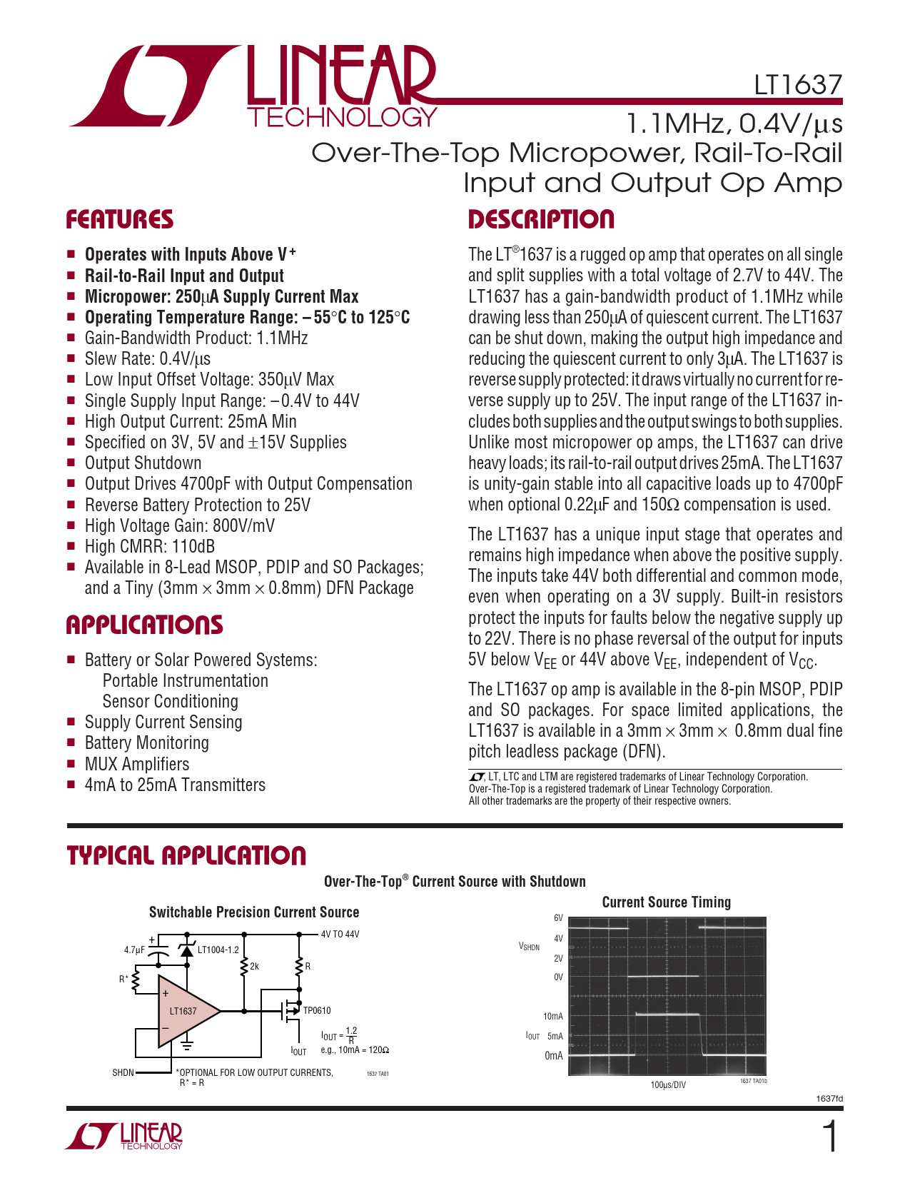 LT1637 1.1MHz, 0.4V/µs Over-The-Top Micropower, Rail-To-Rail Input and Output Op Amp UFEATURESDESCRIPTIO ■ Operates with Inputs Above V + The LT®1637 is a rugged op amp that operates on all single ■ Rail-to-Rail Input and Output and split supplies with a total voltage of 2.7V to 44V. The ■ Micropower: 250 µ A Supply Current Max LT1637 has a gain-bandwidth product of 1.1MHz while ■ Operating Temperature Range: – 55 ° C to 125 ° C drawing less than 250µA of quiescent current. The LT1637 ■ Gain-Bandwidth Product: 1.1MHz can be shut down, making the output high impedance and ■ Slew Rate: 0.4V/µs reducing the quiescent current to only 3µA. The LT1637 is ■ Low Input Offset Voltage: 350µV Max reverse supply protected: it draws virtually no current for re- ■ Single Supply Input Range: – 0.4V to 44V verse supply up to 25V. The input range of the LT1637 in- ■ High Output Current: 25mA Min cludes both supplies and the output swings to both supplies. ■ Specified on 3V, 5V and ±15V Supplies Unlike most micropower op amps, the LT1637 can drive ■ Output Shutdown heavy loads; its rail-to-rail output drives 25mA. The LT1637 ■ Output Drives 4700pF with Output Compensation is unity-gain stable into all capacitive loads up to 4700pF ■ Reverse Battery Protection to 25V when optional 0.22µF and 150Ω compensation is used. ■ High Voltage Gain: 800V/mV The LT1637 has a unique input stage that operates and ■ High CMRR: 110dB remains high impedance when above the positive supply. ■ Available in 8-Lead MSOP, PDIP and SO Packages; The inputs take 44V both differential and common mode, and a Tiny (3mm × 3mm × 0.8mm) DFN Package even when operating on a 3V supply. Built-in resistors U protect the inputs for faults below the negative supply up APPLICATIO S to 22V. There is no phase reversal of the output for inputs ■ Battery or Solar Powered Systems: 5V below VEE or 44V above VEE, independent of VCC. Portable Instrumentation The LT1637 op amp is available in the 8-pin MSOP, PDIP Sensor Conditioning and SO packages. For space limited applications, the ■ Supply Current Sensing LT1637 is available in a 3mm × 3mm × 0.8mm dual fine ■ Battery Monitoring pitch leadless package (DFN). ■ MUX Amplifiers ■ 4mA to 25mA Transmitters , LT, LTC and LTM are registered trademarks of Linear Technology Corporation. Over-The-Top is a registered trademark of Linear Technology Corporation. All other trademarks are the property of their respective owners. UTYPICAL APPLICATIOOver-The-Top® Current Source with ShutdownCurrent Source TimingSwitchable Precision Current Source 6V 4V TO 44V + 4V V 4.7µF LT1004-1.2 SHDN 2V 2k R R* 0V + LT1637 TP0610 10mA – 1.2 IOUT = IOUT 5mA R IOUT e.g., 10mA = 120Ω 0mA SHDN *OPTIONAL FOR LOW OUTPUT CURRENTS, 1637 TA01 R* = R 100µs/DIV 1637 TA01b 1637fd 1