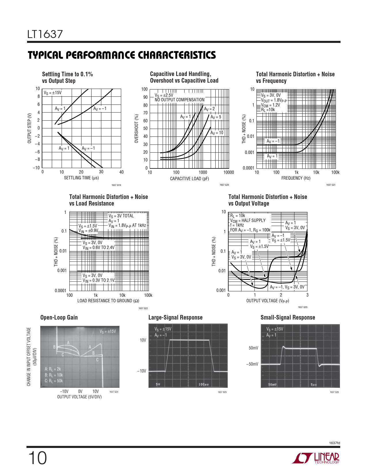 V V V S = ± 15V S = ±15V S = ±15V AV = –1 AV = 1 10V A B A 50mV C B µV/DIV) C (50 – 50mV A: RL = 2k – 10V B: RL = 10k C: RL = 50k CHANGE IN INPUT OFFSET VOLTAGE –10V 0V 10V 1637 G24 1637 G25 1637 G26 OUTPUT VOLTAGE (5V/DIV) 1637fd 10