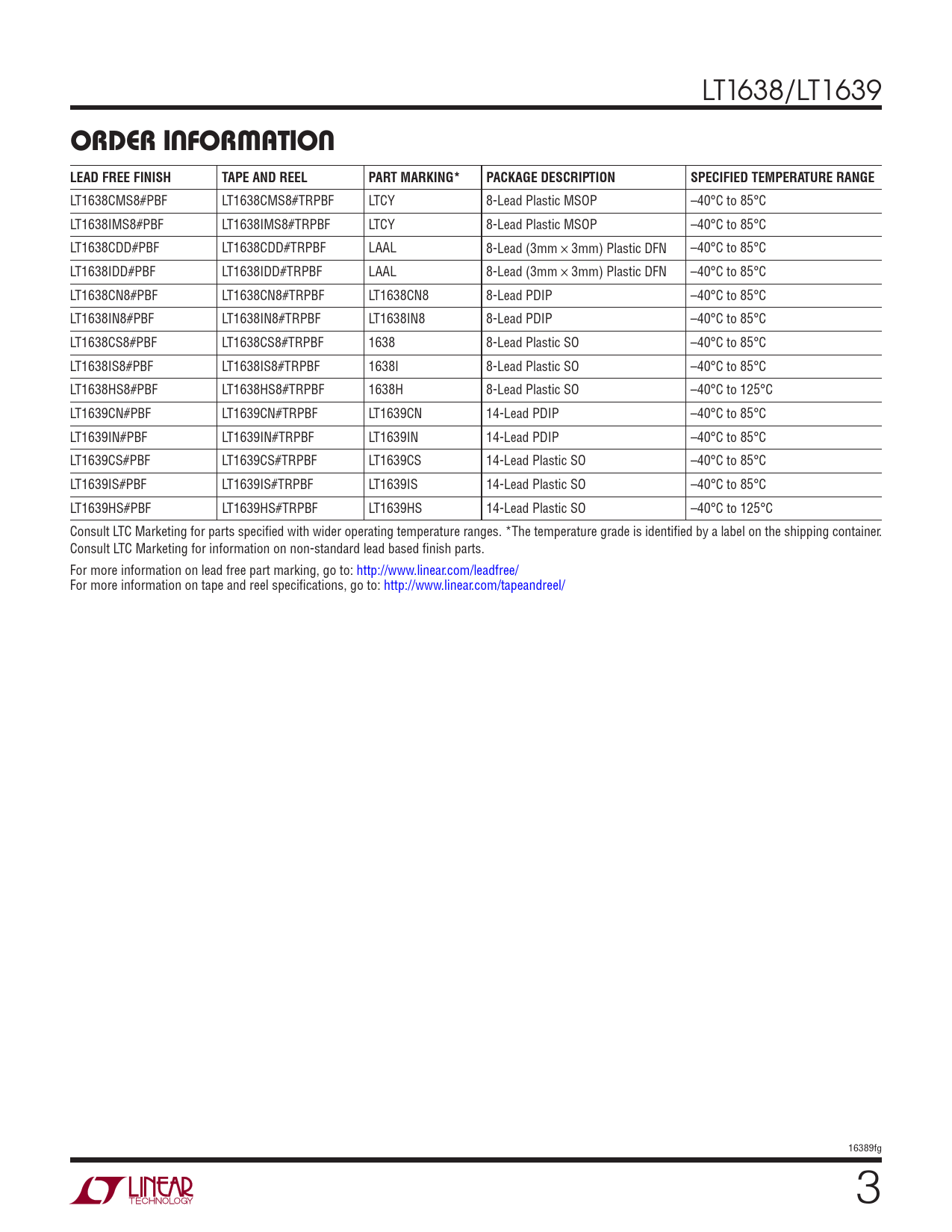 LT1638CMS8#PBF LT1638CMS8#TRPBF LTCY 8-Lead Plastic MSOP –40°C to 85°C LT1638IMS8#PBF LT1638IMS8#TRPBF LTCY 8-Lead Plastic MSOP –40°C to 85°C LT1638CDD#PBF LT1638CDD#TRPBF LAAL 8-Lead (3mm × 3mm) Plastic DFN –40°C to 85°C LT1638IDD#PBF LT1638IDD#TRPBF LAAL 8-Lead (3mm × 3mm) Plastic DFN –40°C to 85°C LT1638CN8#PBF LT1638CN8#TRPBF LT1638CN8 8-Lead PDIP –40°C to 85°C LT1638IN8#PBF LT1638IN8#TRPBF LT1638IN8 8-Lead PDIP –40°C to 85°C LT1638CS8#PBF LT1638CS8#TRPBF 1638 8-Lead Plastic SO –40°C to 85°C LT1638IS8#PBF LT1638IS8#TRPBF 1638I 8-Lead Plastic SO –40°C to 85°C LT1638HS8#PBF LT1638HS8#TRPBF 1638H 8-Lead Plastic SO –40°C to 125°C LT1639CN#PBF LT1639CN#TRPBF LT1639CN 14-Lead PDIP –40°C to 85°C LT1639IN#PBF LT1639IN#TRPBF LT1639IN 14-Lead PDIP –40°C to 85°C LT1639CS#PBF LT1639CS#TRPBF LT1639CS 14-Lead Plastic SO –40°C to 85°C LT1639IS#PBF LT1639IS#TRPBF LT1639IS 14-Lead Plastic SO –40°C to 85°C LT1639HS#PBF LT1639HS#TRPBF LT1639HS 14-Lead Plastic SO –40°C to 125°C Consult LTC Marketing for parts specifi ed with wider operating temperature ranges. *The temperature grade is identifi ed by a label on the shipping container. Consult LTC Marketing for information on non-standard lead based fi nish parts. For more information on lead free part marking, go to: http://www.linear.com/leadfree/ For more information on tape and reel specifi cations, go to: http://www.linear.com/tapeandreel/ 16389fg 3