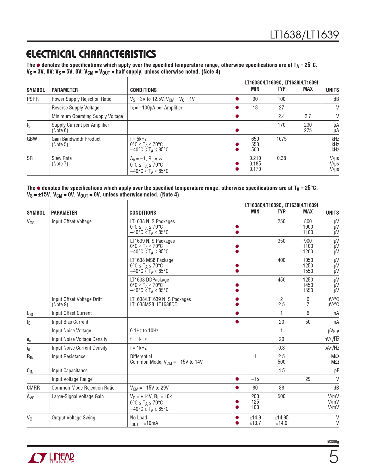 LT1638/LT1639 ELECTRICAL CHARACTERISTICSThe l denotes the specifi cations which apply over the specifi ed temperature range, otherwise specifi cations are at TA = 25°C.VS = 3V, 0V; VS = 5V, 0V; VCM = VOUT = half supply, unless otherwise noted. (Note 4)LT1638C/LT1639C, LT1638I/LT1639ISYMBOLPARAMETERCONDITIONSMINTYPMAXUNITS PSRR Power Supply Rejection Ratio VS = 3V to 12.5V, VCM = VO = 1V l 90 100 dB Reverse Supply Voltage IS = – 100μA per Amplifi er l 18 27 V Minimum Operating Supply Voltage l 2.4 2.7 V IS Supply Current per Amplifi er 170 230 μA (Note 6) l 275 μA GBW Gain Bandwidth Product f = 5kHz 650 1075 kHz (Note 5) 0°C ≤ TA ≤ 70°C l 550 kHz – 40°C ≤ TA ≤ 85°C l 500 kHz SR Slew Rate AV = – 1, RL = ∞ 0.210 0.38 V/μs (Note 7) 0°C ≤ T l 0.185 V/μs A ≤ 70°C – 40°C ≤ T l 0.170 V/μs A ≤ 85°C The l denotes the specifi cations which apply over the specifi ed temperature range, otherwise specifi cations are at TA = 25°C.VS = ±15V, VCM = 0V, VOUT = 0V, unless otherwise noted. (Note 4)LT1638C/LT1639C, LT1638I/LT1639ISYMBOLPARAMETERCONDITIONSMINTYPMAXUNITS VOS Input Offset Voltage LT1638 N, S Packages 250 800 μV 0°C ≤ TA ≤ 70°C l 1000 μV – 40°C ≤ TA ≤ 85°C l 1100 μV LT1639 N, S Packages 350 900 μV 0°C ≤ TA ≤ 70°C l 1100 μV – 40°C ≤ TA ≤ 85°C l 1200 μV LT1638 MS8 Package 400 1050 μV 0°C ≤ TA ≤ 70°C l 1250 μV – 40°C ≤ TA ≤ 85°C l 1550 μV LT1638 DDPackage 450 1250 μV 0°C ≤ TA ≤ 70°C l 1450 μV – 40°C ≤ TA ≤ 85°C l 1550 μV Input Offset Voltage Drift LT1638/LT1639 N, S Packages l 2 6 μV/°C (Note 9) LT1638MS8, LT1638DD l 2.5 7 μV/°C IOS Input Offset Current l 1 6 nA IB Input Bias Current l 20 50 nA Input Noise Voltage 0.1Hz to 10Hz 1 μVP-P en Input Noise Voltage Density f = 1kHz 20 nV/√Hz in Input Noise Current Density f = 1kHz 0.3 pA/√Hz RIN Input Resistance Differential 1 2.5 MΩ Common Mode, VCM = – 15V to 14V 500 MΩ CIN Input Capacitance 4.5 pF Input Voltage Range l –15 29 V CMRR Common Mode Rejection Ratio VCM = –15V to 29V l 80 88 dB AVOL Large-Signal Voltage Gain VO = ± 14V, RL = 10k 200 500 V/mV 0°C ≤ T l 125 V/mV A ≤ 70°C – 40°C ≤ T l 100 V/mV A ≤ 85°C VO Output Voltage Swing No Load l ±14.9 ±14.95 V IOUT = ±10mA l ±13.7 ±14.0 V 16389fg 5