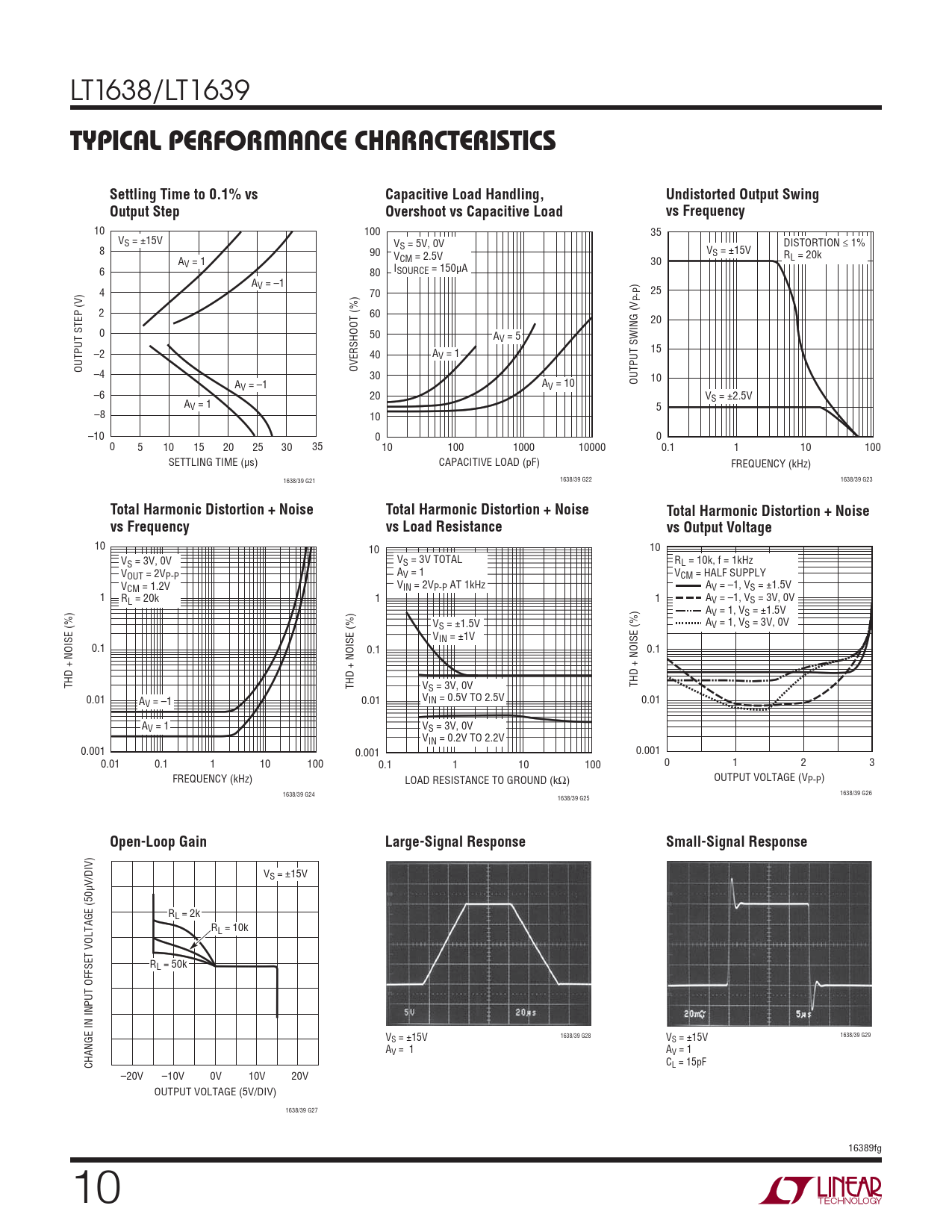 10 100 35 VS = ±15V V DISTORTION ≤ 1% 8 S = 5V, 0V 90 VS = ±15V R A VCM = 2.5V L = 20k V = 1 30 6 80 ISOURCE = 150μA AV = –1 ) 4 70 25 P-P 2 60 20 0 50 AV = 5 15 –2 40 AV = 1 OUTPUT STEP (V) OVERSHOOT (%) –4 30 10 A OUTPUT SWING (V V = –1 AV = 10 –6 20 V A S = ±2.5V V = 1 5 –8 10 –10 0 0 0 5 10 15 20 25 30 35 10 100 1000 10000 0.1 1 10 100 SETTLING TIME (μs) CAPACITIVE LOAD (pF) FREQUENCY (kHz) 1638/39 G21 1638/39 G22 1638/39 G23