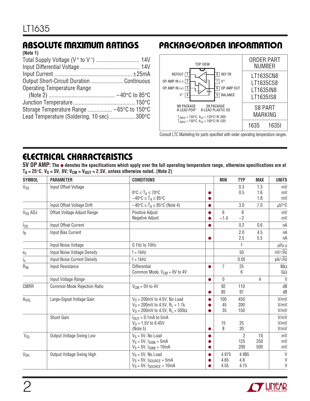 LT1635 WWWUUWUABSOLUTE AXI U RATI GSPACKAGE/ORDER I FOR ATIO(Note 1) Total Supply Voltage (V + to V –) .. 14V ORDER PART Input Differential Voltage ... 14V TOP VIEW NUMBER Input Current .. ±25mA REFOUT 1 – 8 REF FB LT1635CN8 Output Short-Circuit Duration ... Continuous + OP AMP IN (–) 2 7 V+ LT1635CS8 – Operating Temperature Range OP AMP IN (+) 3 6 OP AMP OUT + + LT1635IN8 (Note 2) .. – 40°C to 85°C V– 4 5 BALANCE LT1635IS8 Junction Temperature ... 150°C N8 PACKAGE S8 PACKAGE Storage Temperature Range ... – 65°C to 150°C S8 PART 8-LEAD PDIP 8-LEAD PLASTIC SO Lead Temperature (Soldering, 10 sec).. 300°C MARKING TJMAX = 150°C, θJA = 130°C/ W (N8) TJMAX = 150°C, θJA = 190°C/ W (S8) 1635 1635I Consult LTC Marketing for parts specified with wider operating temperature ranges. ELECTRICAL CHARACTERISTICS5V OP AMP: The ● denotes the specifications which apply over the full operating temperature range, otherwise specifications are at TA = 25 ° C. VS = 5V, 0V; VCM = VOUT = 2.5V, unless otherwise noted. (Note 2)SYMBOLPARAMETERCONDITIONSMINTYPMAXUNITS VOS Input Offset Voltage 0.3 1.3 mV 0°C ≤ TA ≤ 70°C ● 0.5 1.6 mV – 40°C ≤ TA ≤ 85°C ● 1.8 mV Input Offset Voltage Drift – 40°C ≤ TA ≤ 85°C (Note 4) ● 3.0 7.0 µV/°C VOS ADJ Offset Voltage Adjust Range Positive Adjust ● 6 8 mV Negative Adjust ● – 1.4 – 2 mV IOS Input Offset Current ● 0.2 0.6 nA IB Input Bias Current 2.0 4.5 nA ● 2.5 5.5 nA Input Noise Voltage 0.1Hz to 10Hz 1 µVP-P en Input Noise Voltage Density f = 1kHz 50 nV/√Hz in Input Noise Current Density f = 1kHz 0.05 pA/√Hz RIN Input Resistance Differential ● 7 25 MΩ Common Mode, VCM = 0V to 4V 6 GΩ Input Voltage Range ● 0 4 V CMRR Common Mode Rejection Ratio VCM = 0V to 4V 92 110 dB ● 85 97 dB AVOL Large-Signal Voltage Gain VO = 200mV to 4.5V, No Load ● 100 450 V/mV VO = 200mV to 4.5V, RL = 1.1k ● 45 200 V/mV VO = 200mV to 4.5V, RL = 500Ω ● 35 150 V/mV Shunt Gain IOUT = 0.1mA to 5mA V/mV VO = 1.5V to 6.45V 15 25 V/mV (Note 5) ● 8 20 V/mV VOL Output Voltage Swing Low VS = 5V, No Load ● 2 10 mV VS = 5V, ISINK = 5mA ● 125 250 mV VS = 5V, ISINK = 10mA ● 200 500 mV VOH Output Voltage Swing High VS = 5V, No Load ● 4.975 4.985 V VS = 5V, ISOURCE = 5mA ● 4.65 4.8 V VS = 5V, ISOURCE = 10mA ● 4.55 4.75 V 2