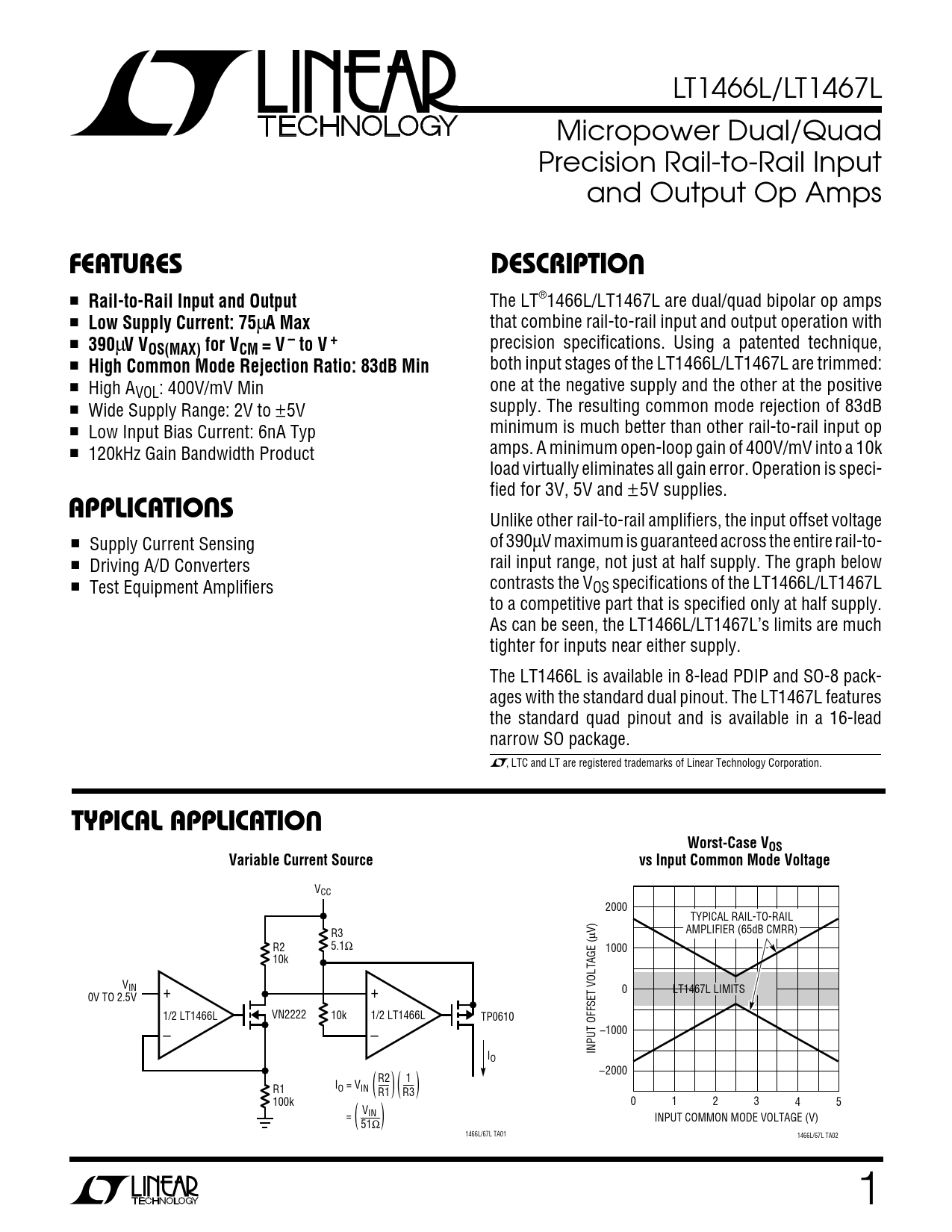LT1466L/LT1467L Micropower Dual/Quad Precision Rail-to-Rail Input and Output Op Amps UFEATURESDESCRIPTION ■ Rail-to-Rail Input and Output The LT®1466L/LT1467L are dual/quad bipolar op amps ■ Low Supply Current: 75 µ A Max that combine rail-to-rail input and output operation with ■ 390 µ V V precision specifications. Using a patented technique, OS(MAX) for VCM = V – to V + ■ High Common Mode Rejection Ratio: 83dB Min both input stages of the LT1466L/LT1467L are trimmed: ■ High A one at the negative supply and the other at the positive VOL: 400V/mV Min ■ Wide Supply Range: 2V to ±5V supply. The resulting common mode rejection of 83dB ■ Low Input Bias Current: 6nA Typ minimum is much better than other rail-to-rail input op ■ 120kHz Gain Bandwidth Product amps. A minimum open-loop gain of 400V/mV into a 10k load virtually eliminates all gain error. Operation is speci- U fied for 3V, 5V and ± 5V supplies. APPLICATIONS Unlike other rail-to-rail amplifiers, the input offset voltage ■ Supply Current Sensing of 390µV maximum is guaranteed across the entire rail-to- ■ rail input range, not just at half supply. The graph below Driving A/D Converters ■ contrasts the V Test Equipment Amplifiers OS specifications of the LT1466L/LT1467L to a competitive part that is specified only at half supply. As can be seen, the LT1466L/LT1467L’s limits are much tighter for inputs near either supply. The LT1466L is available in 8-lead PDIP and SO-8 pack- ages with the standard dual pinout. The LT1467L features the standard quad pinout and is available in a 16-lead narrow SO package. , LTC and LT are registered trademarks of Linear Technology Corporation. UTYPICAL APPLICATIONWorst-Case VOSVariable Current Sourcevs Input Common Mode Voltage VCC 2000 TYPICAL RAIL-TO-RAIL R3 µV) AMPLIFIER (65dB CMRR) R2 5.1Ω 1000 10k VIN + + 0 LT1467L LIMITS 0V TO 2.5V 1/2 LT1466L VN2222 10k 1/2 LT1466L TP0610 – – –1000 INPUT OFFSET VOLTAGE ( IO –2000 R2 ( ) 1( ) R1 IO = VIN R1 R3 100k 0 1 2 3 4 5 V = IN ( ) INPUT COMMON MODE VOLTAGE (V) 51Ω 1466L/67L TA01 1466L/67L TA02 1