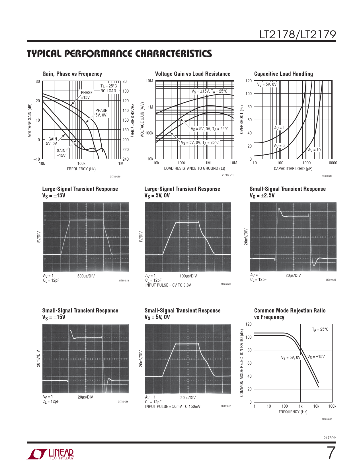 120 TA = 25°C 100 80 /DIV /DIV VS = 5V, 0V VS = p15V 60 20mV 20mV 40 20 A COMMON MODE REJECTION RATIO (dB) V = 1 20μs/DIV AV = 1 20μs/DIV C 21789 G16 L = 12pF CL = 12pF 0 21789 G17 INPUT PULSE = 50mV TO 150mV 1 10 100 1k 10k 100k FREQUENCY (Hz) 21789 G18 21789fc 7