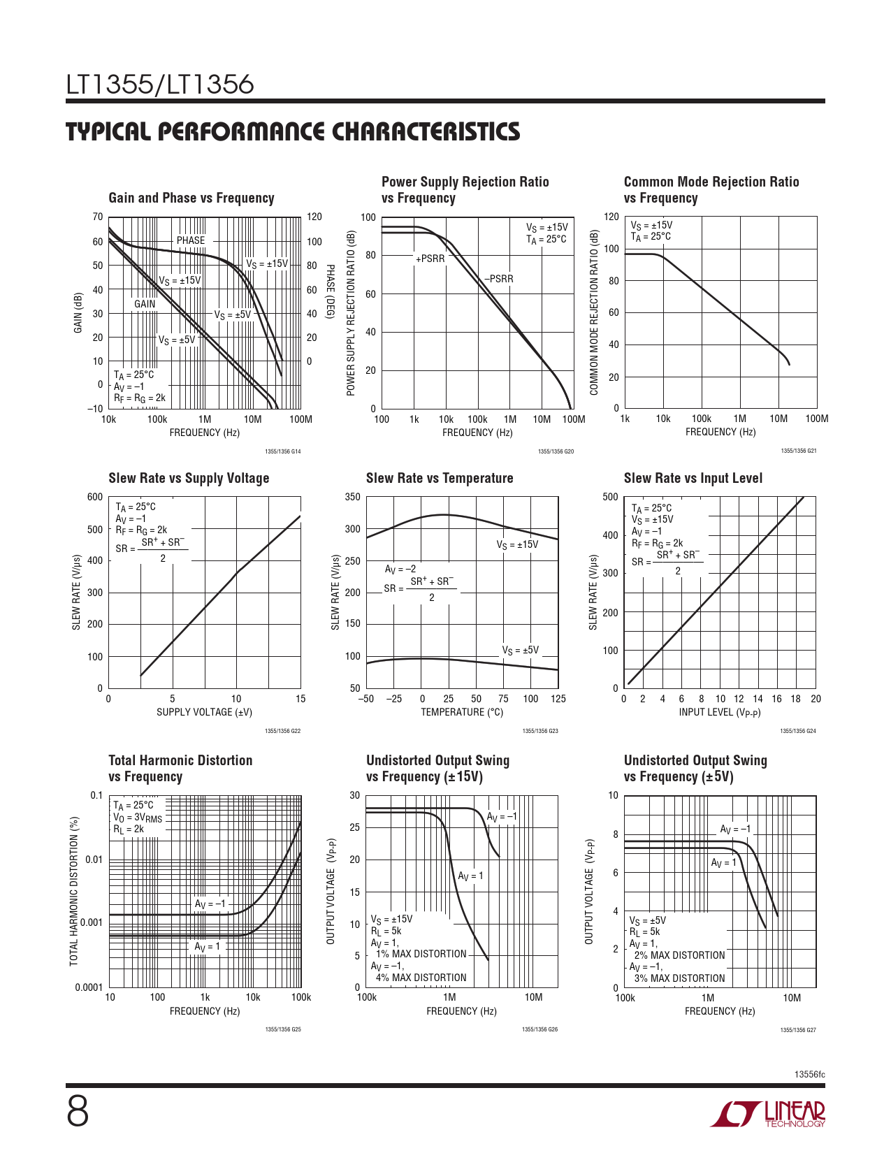 0.1 30 10 TA = 25°C VO = 3VRMS AV = –1 RL = 2k 25 ) 8 AV = –1 P-P P-P 0.01 20 AV = 1 A 6 V = 1 15 AV = –1 4 0.001 10 VS = ±15V VS = ±5V RL = 5k RL = 5k A OUTPUT VOLTAGE (V A OUTPUT VOLTAGE (V A V = 1 V = 1, 2 V = 1, 5 1% MAX DISTORTION 2% MAX DISTORTION TOTAL HARMONIC DISTORTION (%) AV = –1, AV = –1, 4% MAX DISTORTION 3% MAX DISTORTION 0.0001 0 0 10 100 1k 10k 100k 100k 1M 10M 100k 1M 10M FREQUENCY (Hz) FREQUENCY (Hz) FREQUENCY (Hz) 1355/1356 G25 1355/1356 G26 1355/1356 G27 13556fc 8 Document Outline Features Description Applications Typical Application Absolute Maximum Ratings Pin Configuration Order Information Electrical Characteristics Typical Performance Characteristics Applications Information Simplified Schematic Package Description Revision History Typical Applications Related Parts