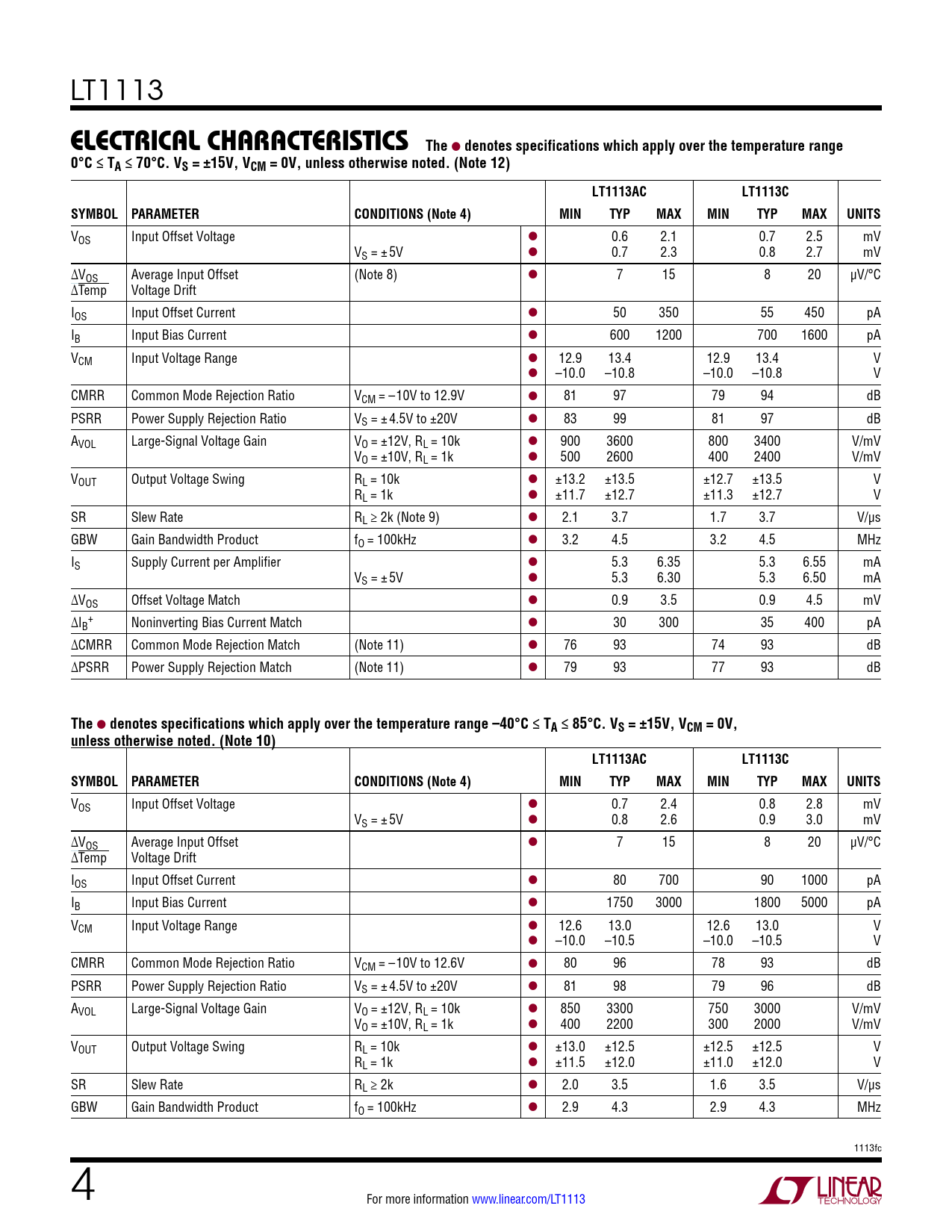 denotes specifications which apply over the temperature range –40°C ≤ TA ≤ 85°C. VS = ±15V, VCM = 0V, unless otherwise noted. (Note 10) LT1113AC LT1113C SYMBOL PARAMETER CONDITIONS (Note 4) MIN TYP MAX MIN TYP MAX UNITS
