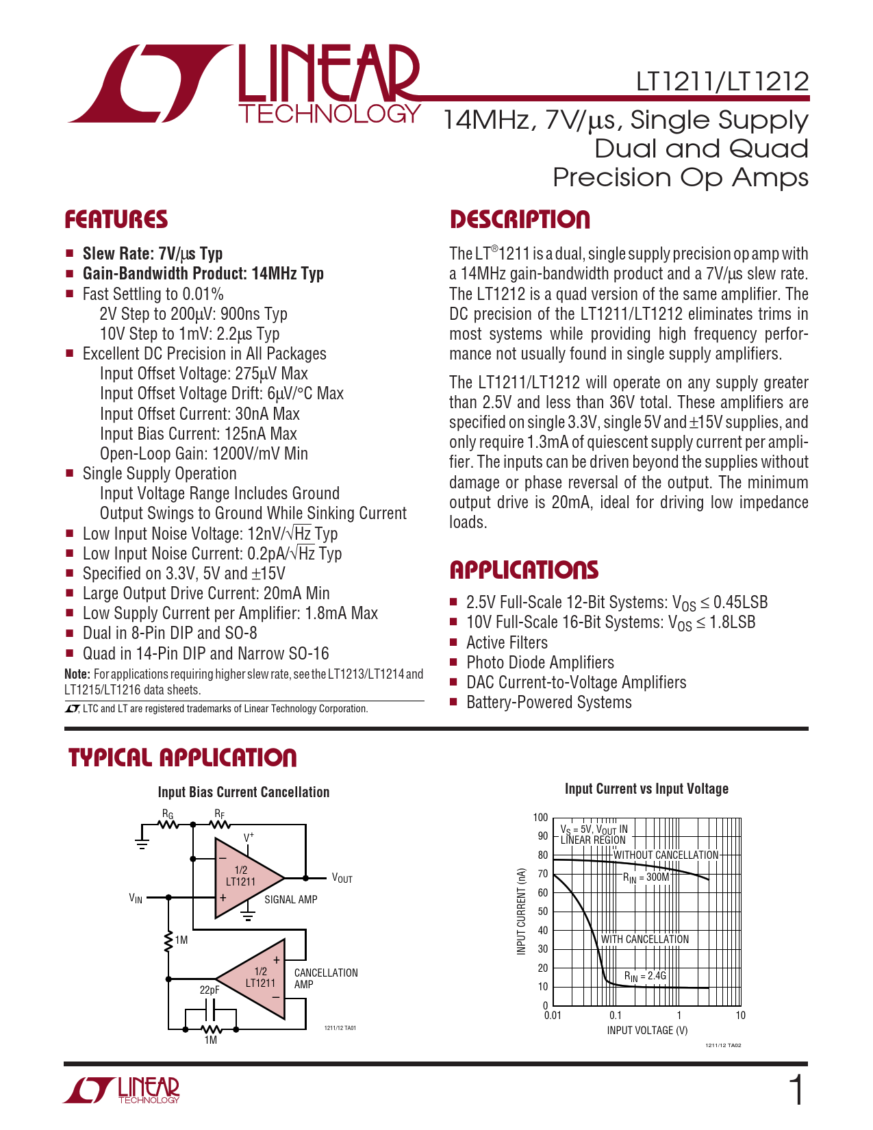LT1211/LT1212 14MHz, 7V/µs, Single Supply Dual and Quad Precision Op Amps UFEATURESDESCRIPTIO ■ Slew Rate: 7V/ µ s Typ The LT®1211 is a dual, single supply precision op amp with ■ Gain-Bandwidth Product: 14MHz Typ a 14MHz gain-bandwidth product and a 7V/µs slew rate. ■ Fast Settling to 0.01% The LT1212 is a quad version of the same amplifier. The 2V Step to 200µV: 900ns Typ DC precision of the LT1211/LT1212 eliminates trims in 10V Step to 1mV: 2.2µs Typ most systems while providing high frequency perfor- ■ Excellent DC Precision in All Packages mance not usually found in single supply amplifiers. Input Offset Voltage: 275µV Max The LT1211/LT1212 will operate on any supply greater Input Offset Voltage Drift: 6µV/°C Max than 2.5V and less than 36V total. These amplifiers are Input Offset Current: 30nA Max specified on single 3.3V, single 5V and ±15V supplies, and Input Bias Current: 125nA Max only require 1.3mA of quiescent supply current per ampli- Open-Loop Gain: 1200V/mV Min fier. The inputs can be driven beyond the supplies without ■ Single Supply Operation damage or phase reversal of the output. The minimum Input Voltage Range Includes Ground output drive is 20mA, ideal for driving low impedance Output Swings to Ground While Sinking Current loads. ■ Low Input Noise Voltage: 12nV/√Hz Typ ■ Low Input Noise Current: 0.2pA/√Hz Typ U ■ Specified on 3.3V, 5V and ±15V APPLICATIO S ■ Large Output Drive Current: 20mA Min ■ 2.5V Full-Scale 12-Bit Systems: V ■ Low Supply Current per Amplifier: 1.8mA Max OS ≤ 0.45LSB ■ 10V Full-Scale 16-Bit Systems: VOS ≤ 1.8LSB ■ Dual in 8-Pin DIP and SO-8 ■ Active Filters ■ Quad in 14-Pin DIP and Narrow SO-16 ■ Photo Diode Amplifiers Note: For applications requiring higher slew rate, see the LT1213/LT1214 and ■ DAC Current-to-Voltage Amplifiers LT1215/LT1216 data sheets. ■ Battery-Powered Systems , LTC and LT are registered trademarks of Linear Technology Corporation. UTYPICAL APPLICATIOInput Bias Current CancellationInput Current vs Input Voltage R R G F 100 VS = 5V, VOUT IN V+ 90 LINEAR REGION – 80 WITHOUT CANCELLATION 1/2 70 LT1211 VOUT RIN = 300M V 60 IN + SIGNAL AMP 50 40 1M WITH CANCELLATION INPUT CURRENT (nA) 30 + 1/2 20 CANCELLATION R LT1211 IN = 2.4G AMP 22pF 10 – 0 0.01 0.1 1 10 1211/12 TA01 INPUT VOLTAGE (V) 1M 1211/12 TA02 1