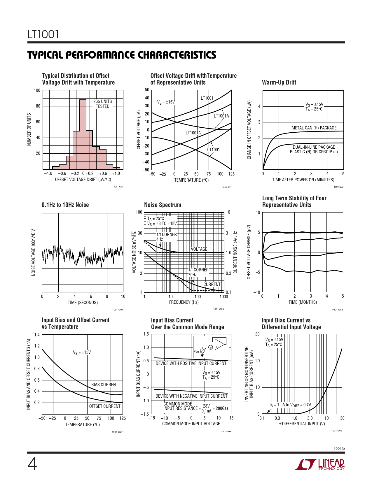 LT1001 WUTYPICAL PERFORMANCE CHARACTERISTICSTypical Distribution of OffsetOffset Voltage Drift withTemperatureVoltage Drift with Temperatureof Representative UnitsWarm-Up Drift 100 50 40 LT1001 265 UNITS VS = ±15V 80 30 µV) V TESTED 4 S = ±15V TA = 25°C µV) 20 LT1001A 60 10 3 METAL CAN (H) PACKAGE 0 LT1001A 40 –10 2 NUMBER OF UNITS –20 OFFSET VOLTAGE ( DUAL-IN-LINE PACKAGE LT1001 20 –30 1 PLASTIC (N) OR CERDIP (J) CHANGE IN OFFSET VOLTAGE ( –40 –50 –1.0 –0.6 –0.2 0 +0.2 +0.6 +1.0 –50 –25 0 25 50 75 100 125 0 1 2 3 4 5 OFFSET VOLTAGE DRIFT (µV/°C) TEMPERATURE (°C) TIME AFTER POWER ON (MINUTES) 1001 G01 1001 G03 1001 G02 Long Term Stability of Four0.1Hz to 10Hz NoiseNoise SpectrumRepresentative Units 100 10 10 TA = 25°C VS = ±3 TO ±18V µV) 5 30 3 √Hz 1/f CORNER √Hz 4Hz VOLTAGE 10 1.0 0 VOLTAGE NOISE nV/ 1/f CORNER –5 NOISE VOLTAGE 100nV/DIV 3 70Hz 0.3 CURRENT NOISE pA/ OFFSET VOLTAGE CHANGE ( CURRENT 1 0.1 –10 0 2 4 6 8 10 1 10 100 1000 0 1 2 3 4 5 TIME (SECONDS) FREQUENCY (Hz) TIME (MONTHS) 1001 G04 1001 G05 1001 G06 Input Bias and Offset CurrentInput Bias CurrentInput Bias Current vsvs TemperatureOver the Common Mode RangeDifferential Input Voltage 1.4 1.5 30 V – S = ±15V 1.2 TA = 25°C 1.0 I + b V VCM S = ±15V 1.0 0.5 20 DEVICE WITH POSITIVE INPUT CURRENT 0.8 0 VS = ±15V T 0.6 A = 25°C BIAS CURRENT –.5 10 0.4 INPUT BIAS CURRENT (nA) DEVICE WITH NEGATIVE INPUT CURRENT INPUT BIAS CURRENT (mA) –1.0 INVERTING OR NON-INVERTING 0.2 COMMON MODE OFFSET CURRENT I 28V B ≈ 1 nA to VDIFF = 0.7V INPUT BIAS AND OFFSET CURRENTS (nA) INPUT RESISTANCE = = 280GΩ 0.1nA –1.5 0 –50 –25 0 25 50 75 100 125 –15 –10 –5 0 5 10 15 0.1 0.3 1.0 3.0 10 30 TEMPERATURE (°C) COMMON MODE INPUT VOLTAGE ±DIFFERENTIAL INPUT (V) 1001 G09 1001 G07 1001 G08 1001fb 4