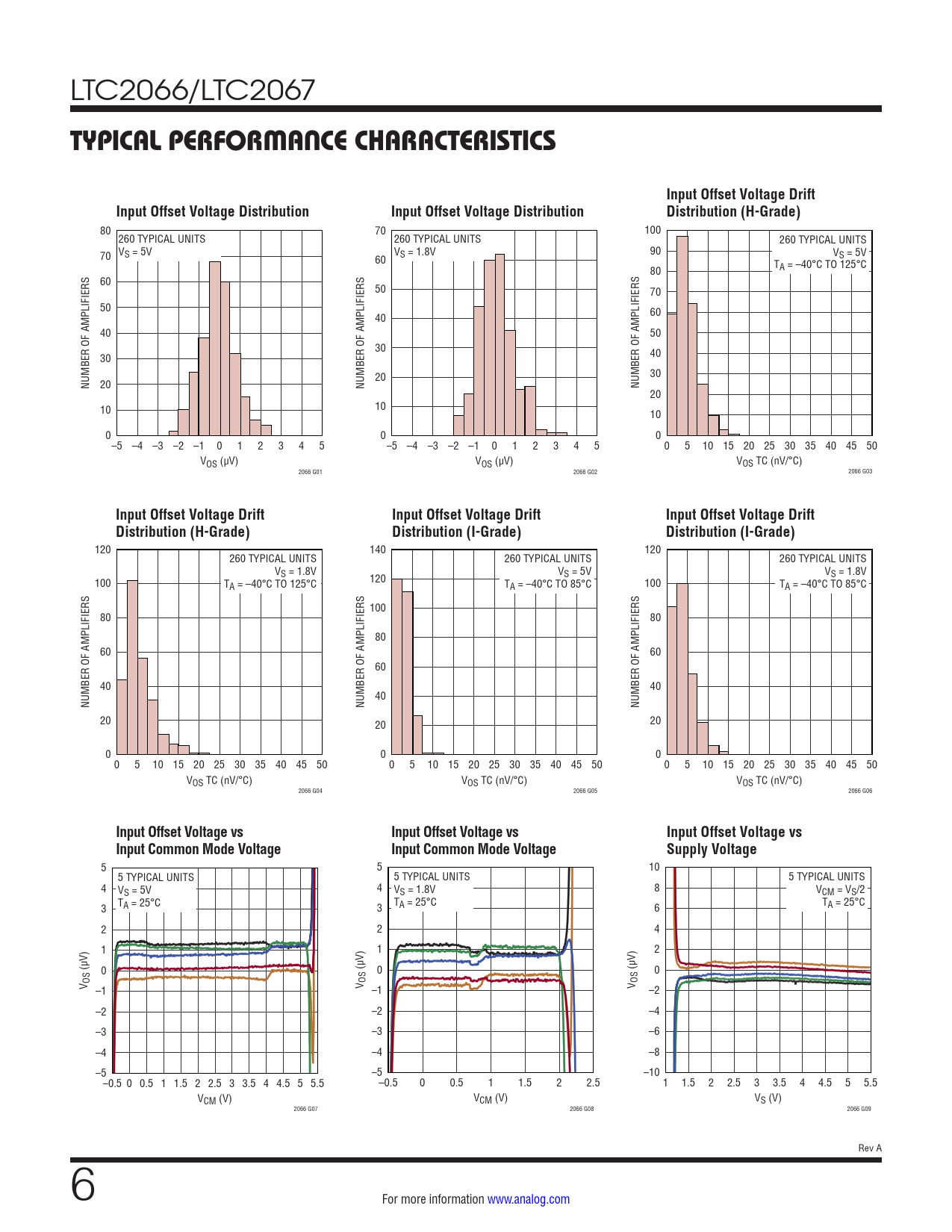 80 70 100 260 TYPICAL UNITS 260 TYPICAL UNITS 260 TYPICAL UNITS V 70 S = 5V VS = 1.8V 90 V 60 S = 5V TA = –40°C TO 125°C 80 60 50 70 50 40 60 40 50 30 30 40 20 30 NUMBER OF AMPLIFIERS 20 NUMBER OF AMPLIFIERS NUMBER OF AMPLIFIERS 20 10 10 10 0 0 0 –5 –4 –3 –2 –1 0 1 2 3 4 5 –5 –4 –3 –2 –1 0 1 2 3 4 5 0 5 10 15 20 25 30 35 40 45 50 VOS (µV) VOS (µV) VOS TC (nV/°C) 2066 G01 2066 G02 2066 G03