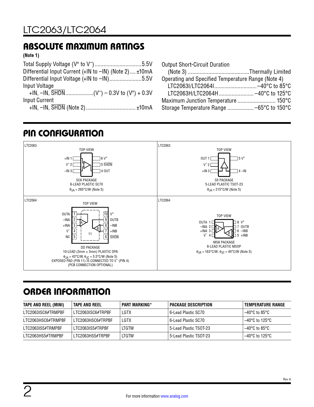 LTC2063ISC6#TRMPBF LTC2063ISC6#TRPBF LGTX 6-Lead Plastic SC70 –40°C to 85°C LTC2063HSC6#TRMPBF LTC2063HSC6#TRPBF LGTX 6-Lead Plastic SC70 –40°C to 125°C LTC2063IS5#TRMPBF LTC2063IS5#TRPBF LTGTW 5-Lead Plastic TSOT-23 –40°C to 85°C LTC2063HS5#TRMPBF LTC2063HS5#TRPBF LTGTW 5-Lead Plastic TSOT-23 –40°C to 125°C Rev A 2 For more information www.analog.com Document Outline Features Applications Typical Application Description Absolute Maximum Ratings Pin Configuration Order Information Electrical Characteristics Typical Performance Characteristics Pin Functions Block Diagram Applications Information Typical Applications Package Description Revision History Typical Application Related Parts