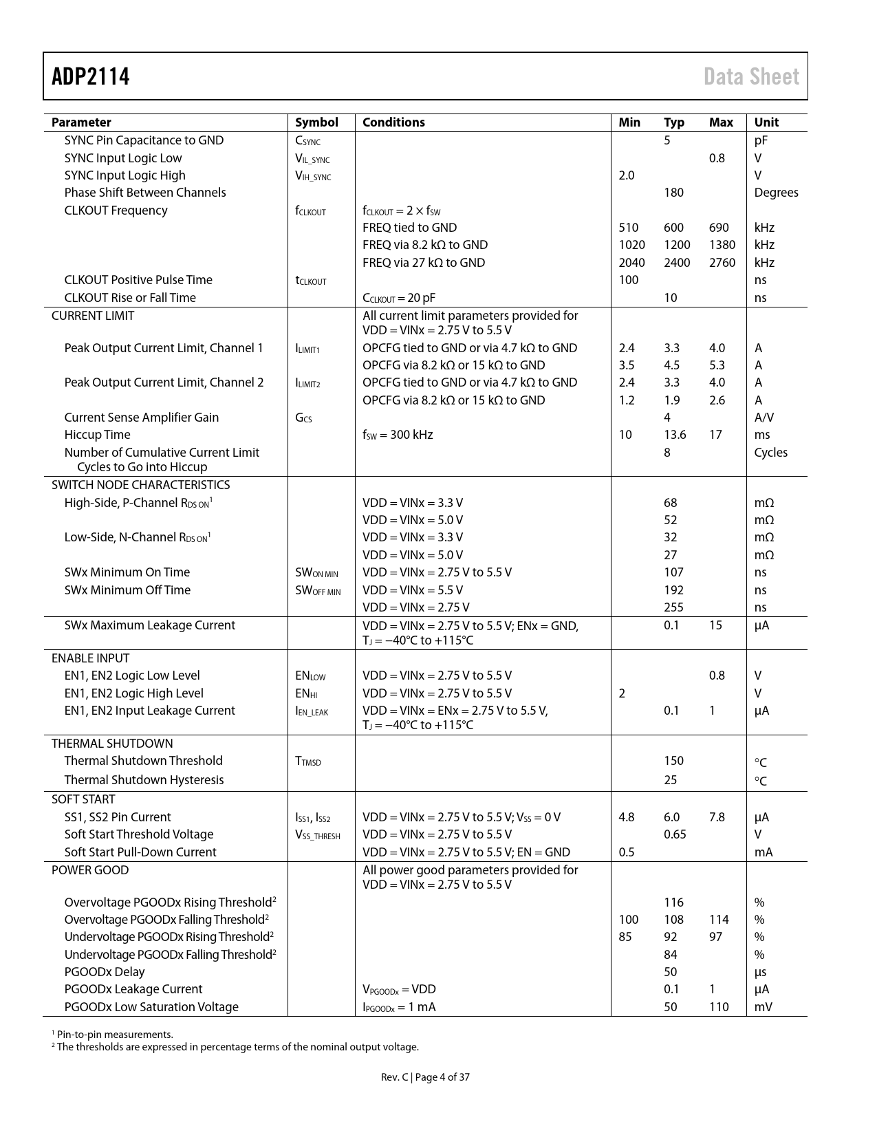 Seiten / Seite37 / 4 — ADP2114. Data Sheet. Parameter Symbol. Conditions Min. Typ. Max. Unit