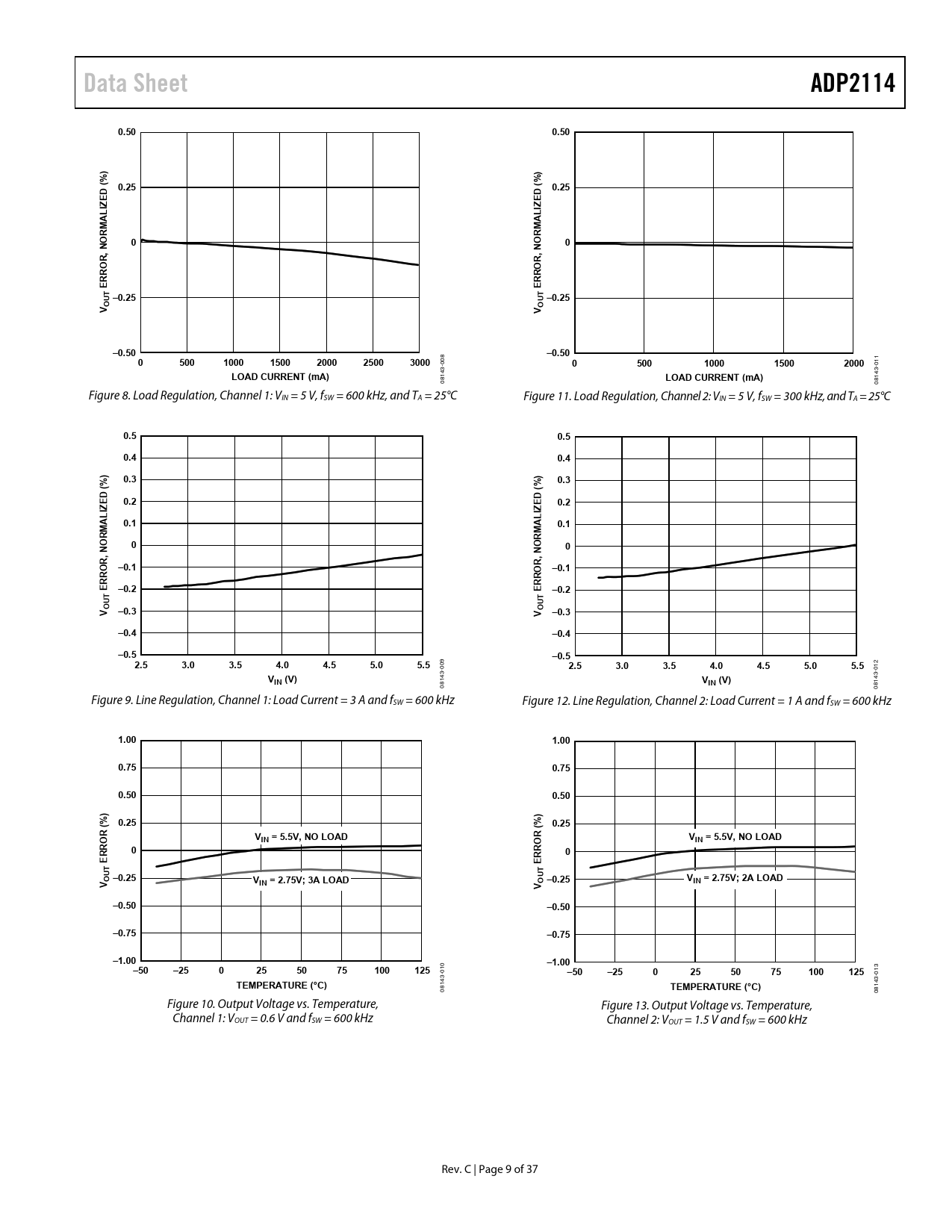 Data Sheet. ADP2114. 0.50. 0.25. IZ L. R, O. RRO. T –0.25. OUV. –0.50. 500. 1000. 1500. 2000. 2500. 3000. LOAD CURRENT (mA). 0.5. 0.4. 0.3. (% D. ED (. 0.2. 0.1. , NO