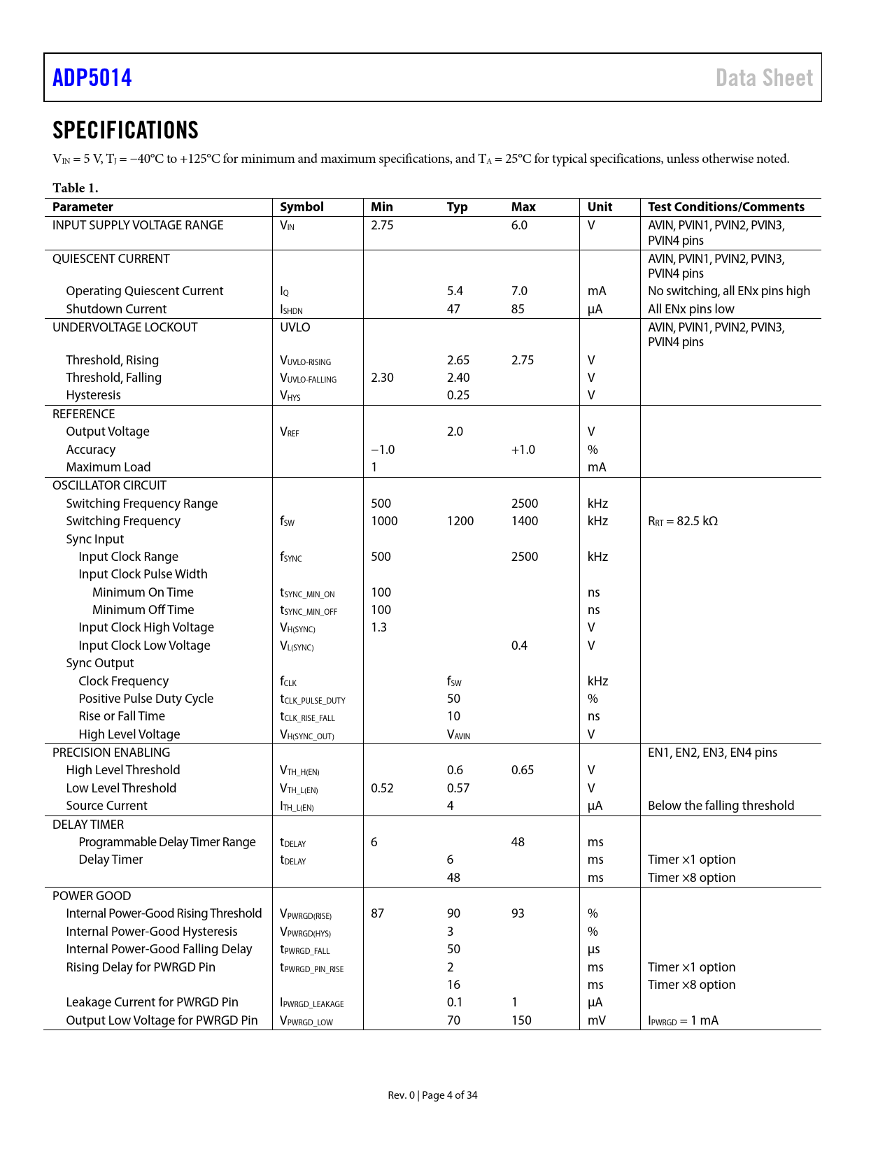 | Seiten / Seite | 34 / 4 — ADP5014. Data Sheet. SPECIFICATIONS. Table 1. Parameter Symbol. Min. Typ. … |