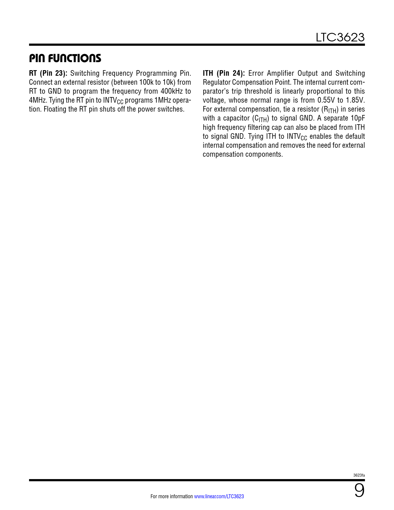 LTC3623 pin FuncTions RT (Pin 23): Switching Frequency Programming Pin. ITH (Pin 24): Error Amplifier Output and Switching Connect an external resistor (between 100k to 10k) from Regulator Compensation Point. The internal current com- RT to GND to program the frequency from 400kHz to parator’s trip threshold is linearly proportional to this 4MHz. Tying the RT pin to INTVCC programs 1MHz opera- voltage, whose normal range is from 0.55V to 1.85V. tion. Floating the RT pin shuts off the power switches. For external compensation, tie a resistor (RITH) in series with a capacitor (CITH) to signal GND. A separate 10pF high frequency filtering cap can also be placed from ITH to signal GND. Tying ITH to INTVCC enables the default internal compensation and removes the need for external compensation components. 3623fa For more information www.linear.com/LTC3623 9