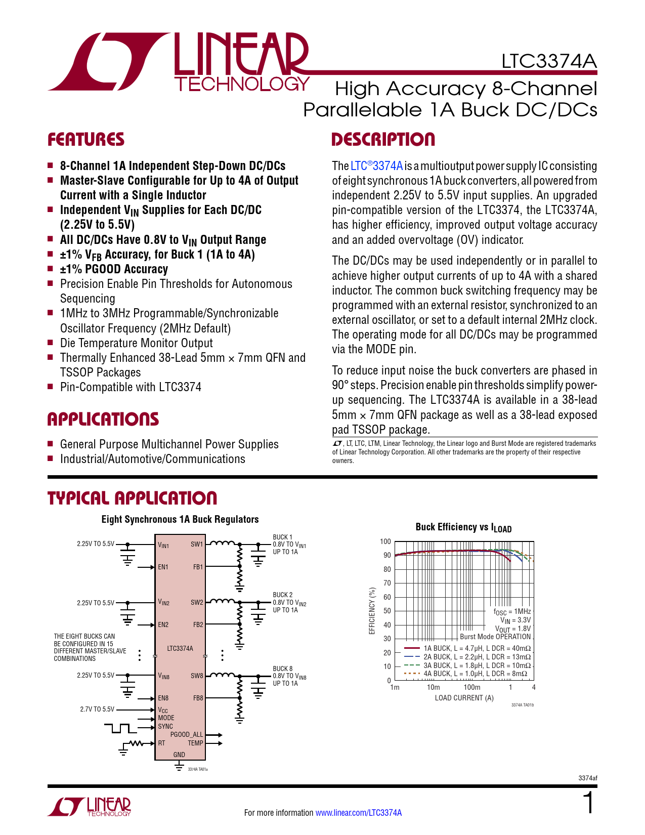 LTC3374A High Accuracy 8-Channel Parallelable 1A Buck DC/DCs FeaTuresDescripTion n 8-Channel 1A Independent Step-Down DC/DCs The LTC®3374A is a multioutput power supply IC consisting n Master-Slave Configurable for Up to 4A of Output of eight synchronous 1A buck converters, all powered from Current with a Single Inductor independent 2.25V to 5.5V input supplies. An upgraded n Independent VIN Supplies for Each DC/DC pin-compatible version of the LTC3374, the LTC3374A, (2.25V to 5.5V) has higher efficiency, improved output voltage accuracy n All DC/DCs Have 0.8V to VIN Output Range and an added overvoltage (OV) indicator. n ±1% VFB Accuracy, for Buck 1 (1A to 4A) The DC/DCs may be used independently or in parallel to n ±1% PGOOD Accuracy achieve higher output currents of up to 4A with a shared n Precision Enable Pin Thresholds for Autonomous inductor. The common buck switching frequency may be Sequencing programmed with an external resistor, synchronized to an n 1MHz to 3MHz Programmable/Synchronizable external oscillator, or set to a default internal 2MHz clock. Oscillator Frequency (2MHz Default) The operating mode for all DC/DCs may be programmed n Die Temperature Monitor Output via the MODE pin. n Thermally Enhanced 38-Lead 5mm × 7mm QFN and TSSOP Packages To reduce input noise the buck converters are phased in n Pin-Compatible with LTC3374 90° steps. Precision enable pin thresholds simplify power- up sequencing. The LTC3374A is available in a 38-lead 5mm × 7mm QFN package as well as a 38-lead exposed applicaTions pad TSSOP package. n General Purpose Multichannel Power Supplies L, LT, LTC, LTM, Linear Technology, the Linear logo and Burst Mode are registered trademarks of Linear Technology Corporation. All other trademarks are the property of their respective n Industrial/Automotive/Communications owners. Typical applicaTionEight Synchronous 1A Buck RegulatorsBuck Efficiency vs ILOAD BUCK 1 2.25V TO 5.5V V 100 IN1 SW1 0.8V TO VIN1 UP TO 1A 90 EN1 FB1 80 70 BUCK 2 60 2.25V TO 5.5V VIN2 SW2 0.8V TO VIN2 UP TO 1A 50 fOSC = 1MHz V V EN2 FB2 OUT = 1.8V 40 IN = 3.3V EFFICIENCY (%) VOUT = 1.8V THE EIGHT BUCKS CAN 30 Burst Mode OPERATION BE CONFIGURED IN 15 LTC3374A DIFFERENT MASTER/SLAVE • • 1A BUCK, L = 4.7µH, L DCR = 40mΩ • • 20 COMBINATIONS • • 2A BUCK, L = 2.2µH, L DCR = 13mΩ BUCK 8 10 3A BUCK, L = 1.8µH, L DCR = 10mΩ 2.25V TO 5.5V VIN8 SW8 0.8V TO V 4A BUCK, L = 1.0µH, L DCR = 8mΩ IN8 UP TO 1A 01m 10m 100m 1 4 EN8 FB8 LOAD CURRENT (A) 3374A TA01b 2.7V TO 5.5V VCC MODE SYNC PGOOD_ALL RT TEMP GND 3374A TA01a 3374af For more information www.linear.com/LTC3374A 1 Document Outline Features Applications Typical Application Description Absolute Maximum Ratings Pin Configuration Order Information (http://www.linear.com/product/LTC3374A#orderinfo) Electrical Characteristics Typical Performance Characteristics Pin Functions Block Diagram Operation Buck Switching Regulators Buck Regulators with Combined Power Stages Power Failure Reporting Via PGOOD_ALL Pin Temperature Monitoring and Overtemperature Protection Programming the Operating Frequency Applications Information Buck Switching Regulator Output Voltage and Feedback Network Input and Output Decoupling Capacitor Selection Combined Buck Regulators Buck Regulators PCB Considerations Package Description Typical Application Related Parts
