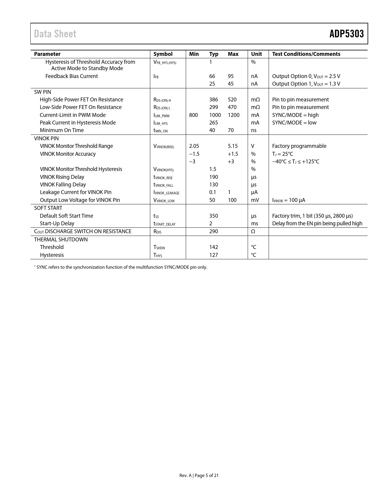 | Seiten / Seite | 21 / 5 — Data Sheet. ADP5303. Parameter. Symbol. Min. Typ. Max. Unit. Test … |