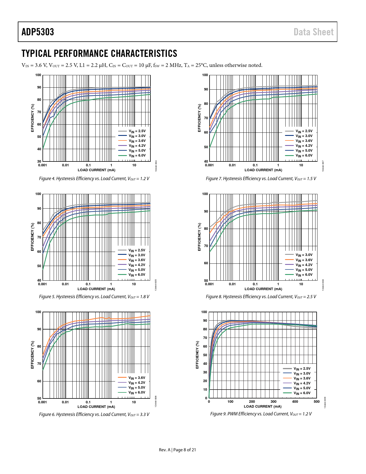 ADP5303. Data Sheet. TYPICAL PERFORMANCE CHARACTERISTICS. 100. NCY. ICI. VIN = 2.5V. VIN = 3.0V. VIN = 3.6V. VIN = 4.2V. VIN = 5.0V