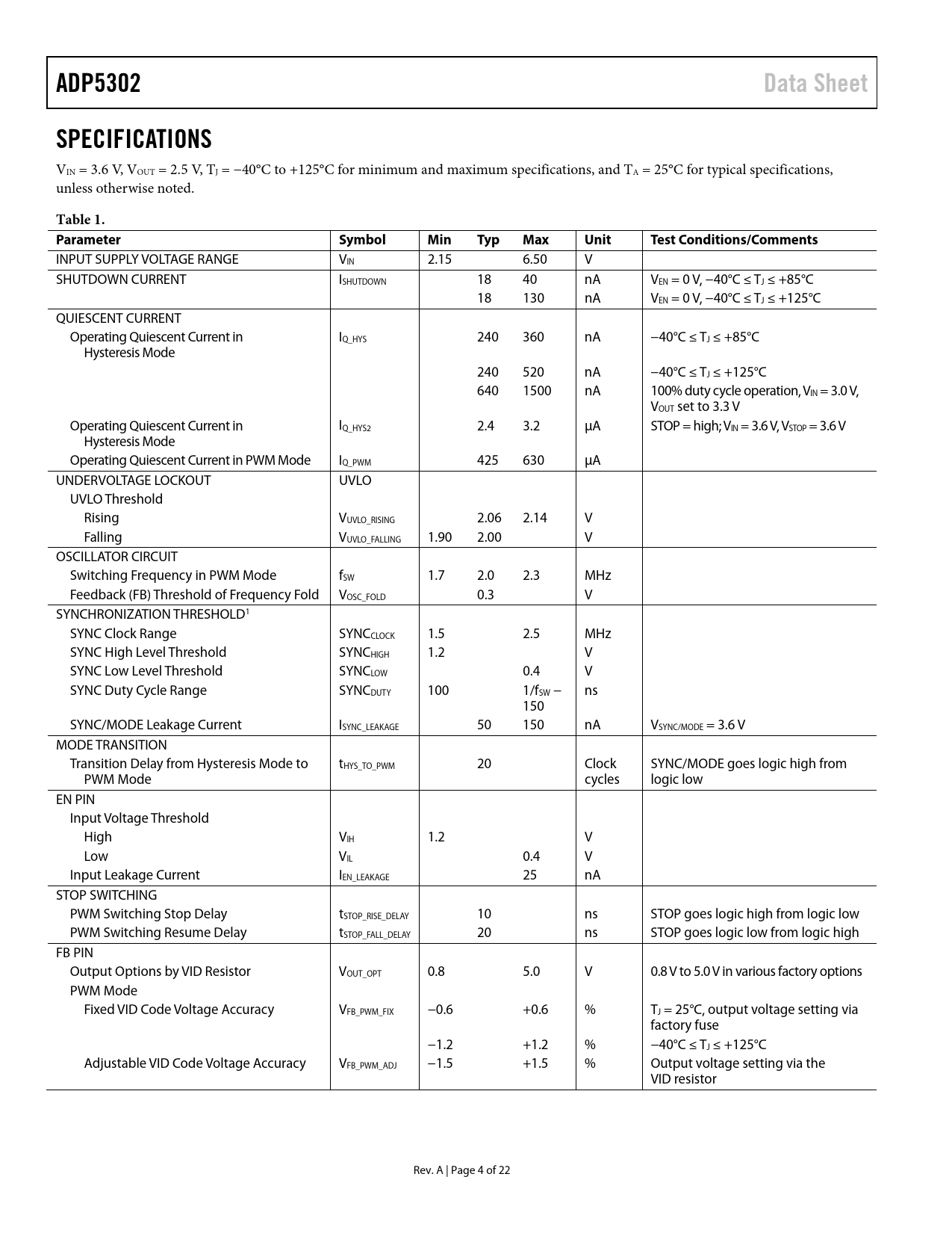 Seiten / Seite22 / 4 — ADP5302. Data Sheet. SPECIFICATIONS. Table 1. Parameter Symbol. Min. Typ. …