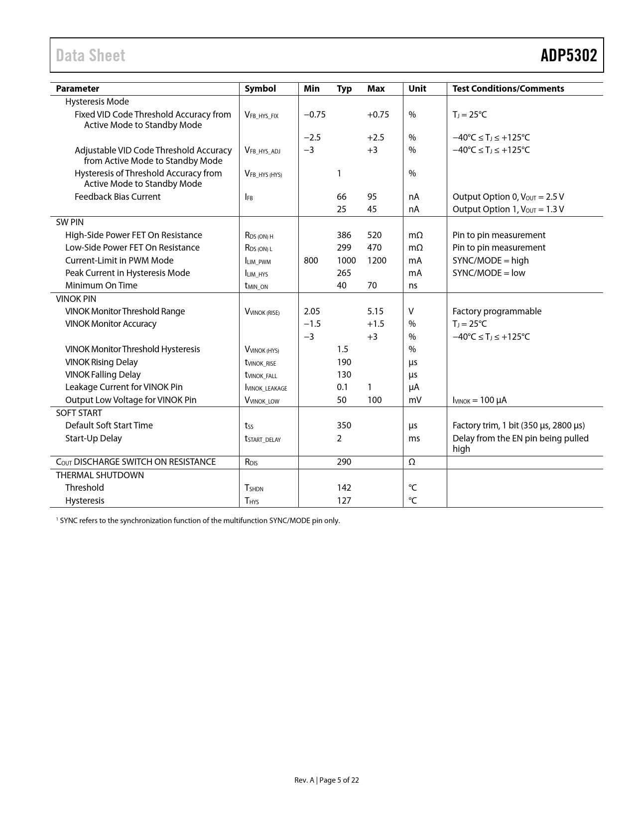 | Seiten / Seite | 22 / 5 — Data Sheet. ADP5302. Parameter Symbol. Min. Typ. Max. Unit. Test. … |