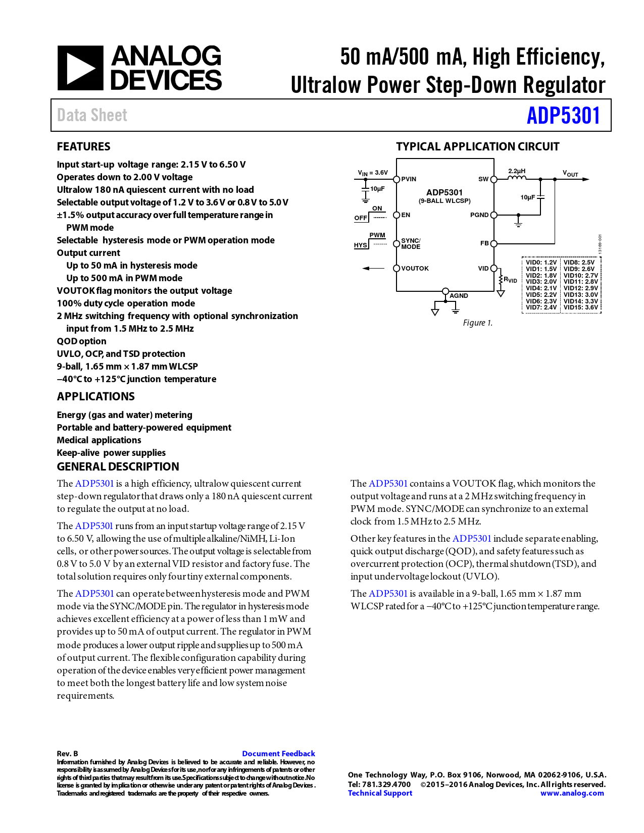 The ADP5301 is a high efficiency, ultralow quiescent current The ADP5301 contains a VOUTOK flag, which monitors the step-down regulator that draws only a 180 nA quiescent current output voltage and runs at a 2 MHz switching frequency in to regulate the output at no load. PWM mode. SYNC/MODE can synchronize to an external The ADP5301 runs from an input startup voltage range of 2.15 V clock from 1.5 MHz to 2.5 MHz. to 6.50 V, allowing the use of multiple alkaline/NiMH, Li-Ion Other key features in the ADP5301 include separate enabling, cells, or other power sources. The output voltage is selectable from quick output discharge (QOD), and safety features such as 0.8 V to 5.0 V by an external VID resistor and factory fuse. The overcurrent protection (OCP), thermal shutdown (TSD), and total solution requires only four tiny external components. input undervoltage lockout (UVLO). The ADP5301 can operate between hysteresis mode and PWM The ADP5301 is available in a 9-ball, 1.65 mm × 1.87 mm mode via the SYNC/MODE pin. The regulator in hysteresis mode WLCSP rated for a −40°C to +125°C junction temperature range. achieves excel ent efficiency at a power of less than 1 mW and provides up to 50 mA of output current. The regulator in PWM mode produces a lower output ripple and supplies up to 500 mA of output current. The flexible configuration capability during operation of the device enables very efficient power management to meet both the longest battery life and low system noise requirements.