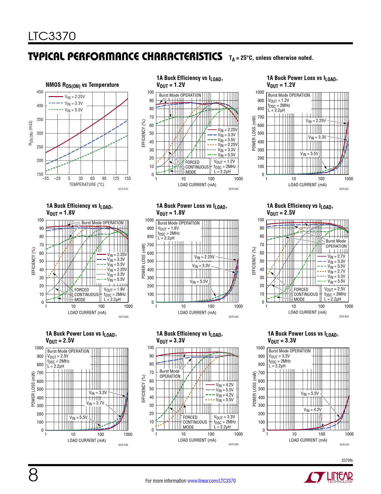 100 1000 100 Burst Mode OPERATION Burst Mode OPERATION 90 900 VOUT = 1.8V 90 f 80 800 OSC = 2MHz L = 2.2µH 80 Burst Mode 70 700 70 OPERATION 60 V 60 IN = 2.25V 600 VIN = 2.25V VIN = 2.7V 50 VIN = 3.3V 500 50 V V IN = 3.3V IN = 5.5V VIN = 3.3V V 40 V IN = 5.5V IN = 2.25V 400 40 EFFICIENCY (%) V V EFFICIENCY (%) IN = 2.7V 30 IN = 3.3V V V POWER LOSS (mW) 300 30 IN = 3.3V IN = 5.5V VIN = 5.5V VIN = 5.5V 20 200 20 FORCED VOUT = 1.8V FORCED VOUT = 2.5V 10 CONTINUOUS fOSC = 2MHz 100 10 CONTINUOUS fOSC = 2MHz MODE L = 2.2µH MODE L = 2.2µH 0 0 0 1 10 100 1000 1 10 100 1000 1 10 100 1000 LOAD CURRENT (mA) LOAD CURRENT (mA) LOAD CURRENT (mA) 3370 G22 3370 G23 3370 G24