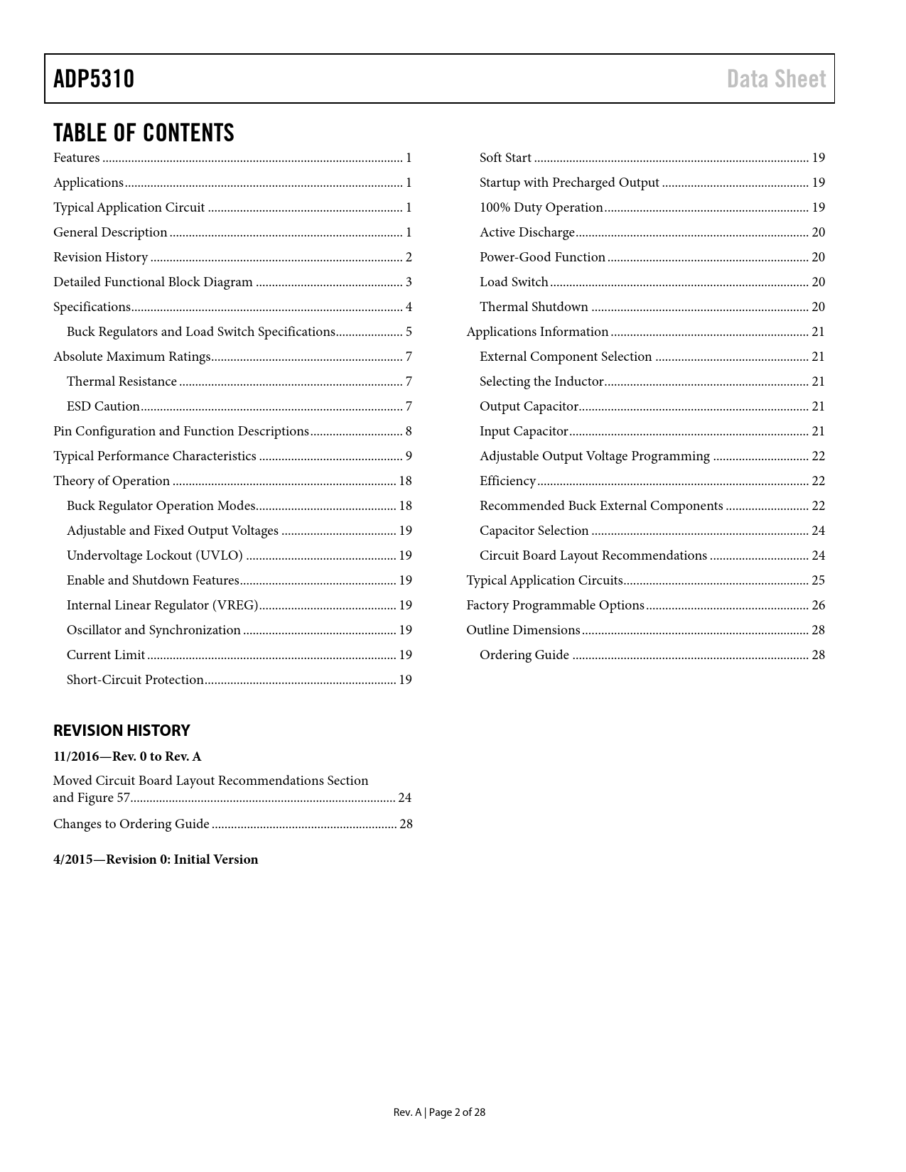 link to page 1 link to page 1 link to page 1 link to page 1 link to page 2 link to page 3 link to page 4 link to page 5 link to page 7 link to page 7 link to page 7 link to page 8 link to page 9 link to page 18 link to page 18 link to page 19 link to page 19 link to page 19 link to page 19 link to page 19 link to page 19 link to page 19 link to page 19 link to page 19 link to page 19 link to page 20 link to page 20 link to page 20 link to page 20 link to page 21 link to page 21 link to page 21 link to page 21 link to page 21 link to page 22 link to page 22 link to page 22 link to page 24 link to page 24 link to page 25 link to page 26 link to page 28 link to page 28 ADP5310Data SheetTABLE OF CONTENTS Features .. 1 Soft Start .. 19 Applications ... 1 Startup with Precharged Output .. 19 Typical Application Circuit ... 1 100% Duty Operation .. 19 General Description ... 1 Active Discharge ... 20 Revision History ... 2 Power-Good Function ... 20 Detailed Functional Block Diagram .. 3 Load Switch ... 20 Specifications ... 4 Thermal Shutdown .. 20 Buck Regulators and Load Switch Specifications ... 5 Applications Information .. 21 Absolute Maximum Ratings .. 7 External Component Selection .. 21 Thermal Resistance .. 7 Selecting the Inductor .. 21 ESD Caution .. 7 Output Capacitor.. 21 Pin Configuration and Function Descriptions ... 8 Input Capacitor ... 21 Typical Performance Characteristics ... 9 Adjustable Output Voltage Programming .. 22 Theory of Operation .. 18 Efficiency ... 22 Buck Regulator Operation Modes .. 18 Recommended Buck External Components .. 22 Adjustable and Fixed Output Voltages .. 19 Capacitor Selection .. 24 Undervoltage Lockout (UVLO) ... 19 Circuit Board Layout Recommendations ... 24 Enable and Shutdown Features ... 19 Typical Application Circuits .. 25 Internal Linear Regulator (VREG) ... 19 Factory Programmable Options ... 26 Oscillator and Synchronization .. 19 Outline Dimensions ... 28 Current Limit .. 19 Ordering Guide .. 28 Short-Circuit Protection .. 19 REVISION HISTORY 11/2016—Rev. 0 to Rev. A Moved Circuit Board Layout Recommendations Section and Figure 57... 24 Changes to Ordering Guide .. 28 4/2015—Revision 0: Initial Version Rev. A | Page 2 of 28 Document Outline FEATURES APPLICATIONS TYPICAL APPLICATION CIRCUIT GENERAL DESCRIPTION TABLE OF CONTENTS REVISION HISTORY DETAILED FUNCTIONAL BLOCK DIAGRAM SPECIFICATIONS BUCK REGULATORS AND LOAD SWITCH SPECIFICATIONS ABSOLUTE MAXIMUM RATINGS THERMAL RESISTANCE ESD CAUTION PIN CONFIGURATION AND FUNCTION DESCRIPTIONS TYPICAL PERFORMANCE CHARACTERISTICS THEORY OF OPERATION BUCK REGULATOR OPERATION MODES PWM Mode PSM Mode Hysteresis Mode Mode Selection ADJUSTABLE AND FIXED OUTPUT VOLTAGES UNDERVOLTAGE LOCKOUT (UVLO) ENABLE AND SHUTDOWN FEATURES INTERNAL LINEAR REGULATOR (VREG) OSCILLATOR AND SYNCHRONIZATION CURRENT LIMIT SHORT-CIRCUIT PROTECTION SOFT START STARTUP WITH PRECHARGED OUTPUT 100% DUTY OPERATION ACTIVE DISCHARGE POWER-GOOD FUNCTION LOAD SWITCH THERMAL SHUTDOWN APPLICATIONS INFORMATION EXTERNAL COMPONENT SELECTION SELECTING THE INDUCTOR OUTPUT CAPACITOR INPUT CAPACITOR ADJUSTABLE OUTPUT VOLTAGE PROGRAMMING EFFICIENCY Power Switch Conduction Losses Inductor Losses Driver Losses Transition Losses RECOMMENDED BUCK EXTERNAL COMPONENTS CAPACITOR SELECTION Output Capacitor Input Bypass Capacitor Input and Output Capacitor Properties CIRCUIT BOARD LAYOUT RECOMMENDATIONS TYPICAL APPLICATION CIRCUITS FACTORY PROGRAMMABLE OPTIONS OUTLINE DIMENSIONS ORDERING GUIDE